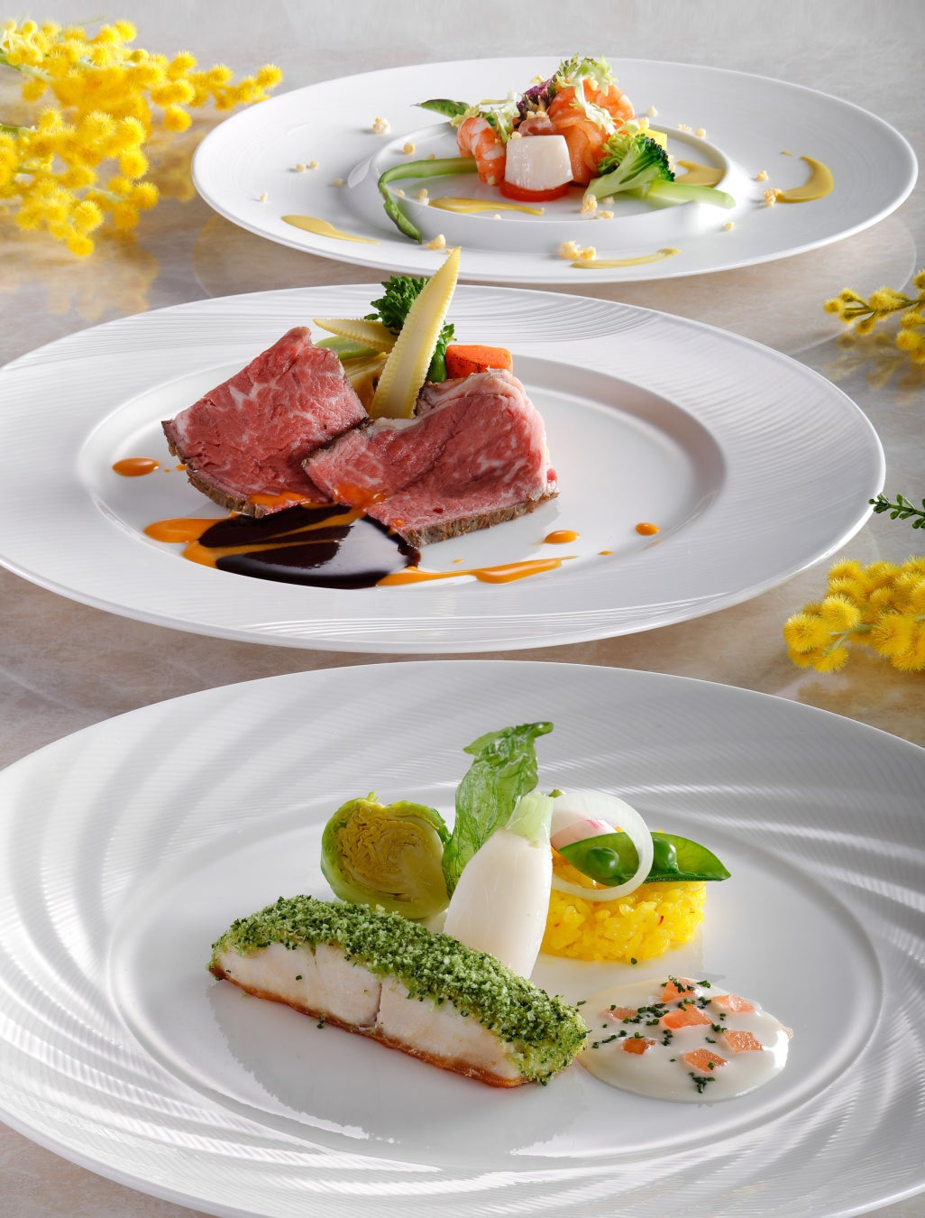 冷菜三種盛り合わせ(柚子クラゲ、蒸し鶏 マスタードソース、焼豚) / 蟹肉ととうもろこしのスープ / 牛肉のオイスターソース炒め / 海老入りワンタンの揚げ物 オレンジ風味の甘酢ソース / 点心二種盛り合わせ / ミモザ仕立てのサラダ / 中国粥 / デザート二種