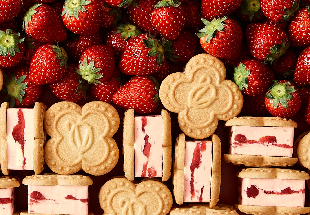 真っ赤な果肉と香り高い甘さが特徴の“イタリア産サブリナ苺”をとろっと煮詰めた苺コンフィチュール。練乳ミルクのコクをなめらかに練り上げたホワイトショコラ。ふたつが柔らかなまま組み合わさった“とろけるダブルメルト製法”が美味しさの決め手です。お口の中で苺とミルクが同時にとろっと溢れる至福の美味しさを、しっとりしたクッキーでサンドしました。