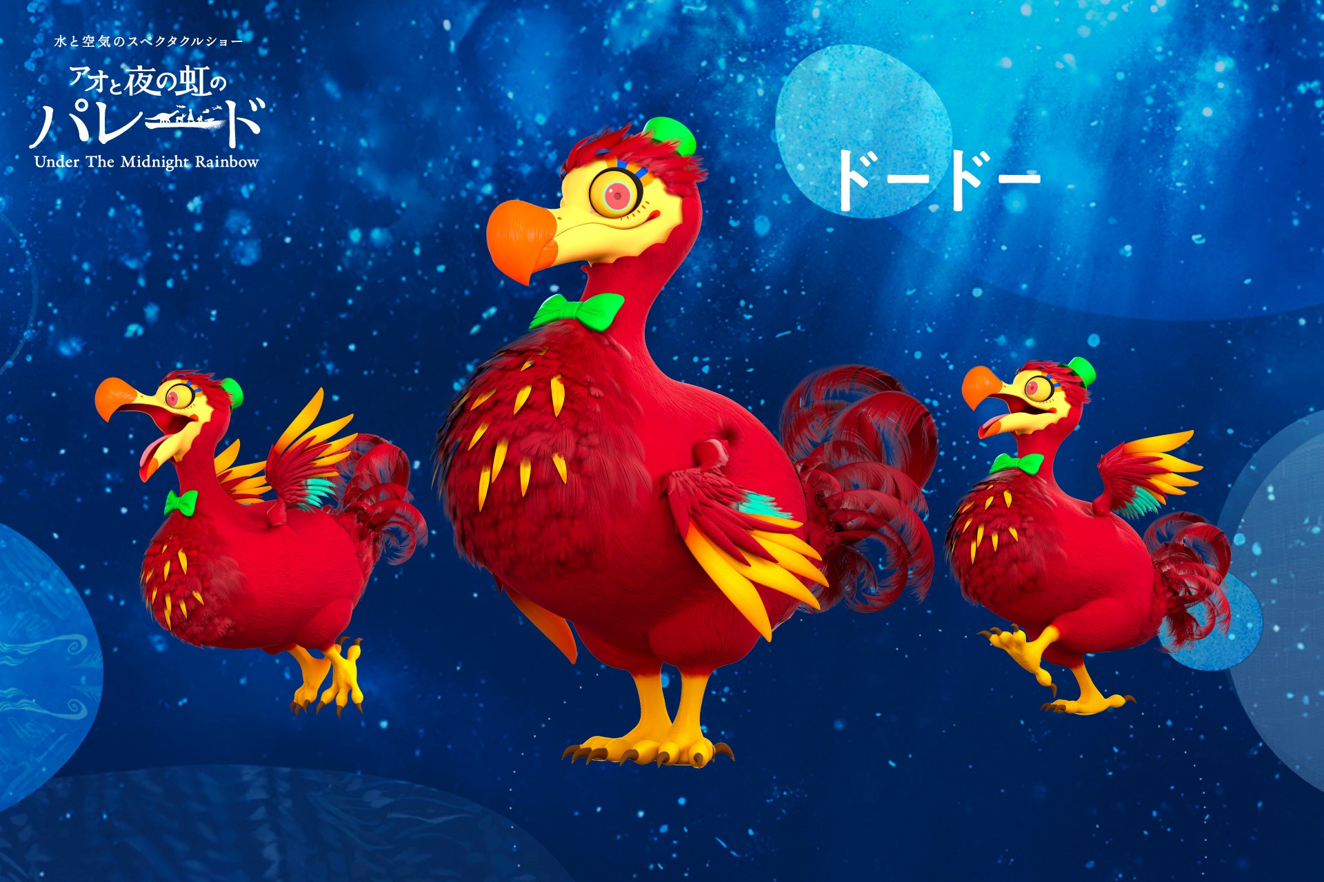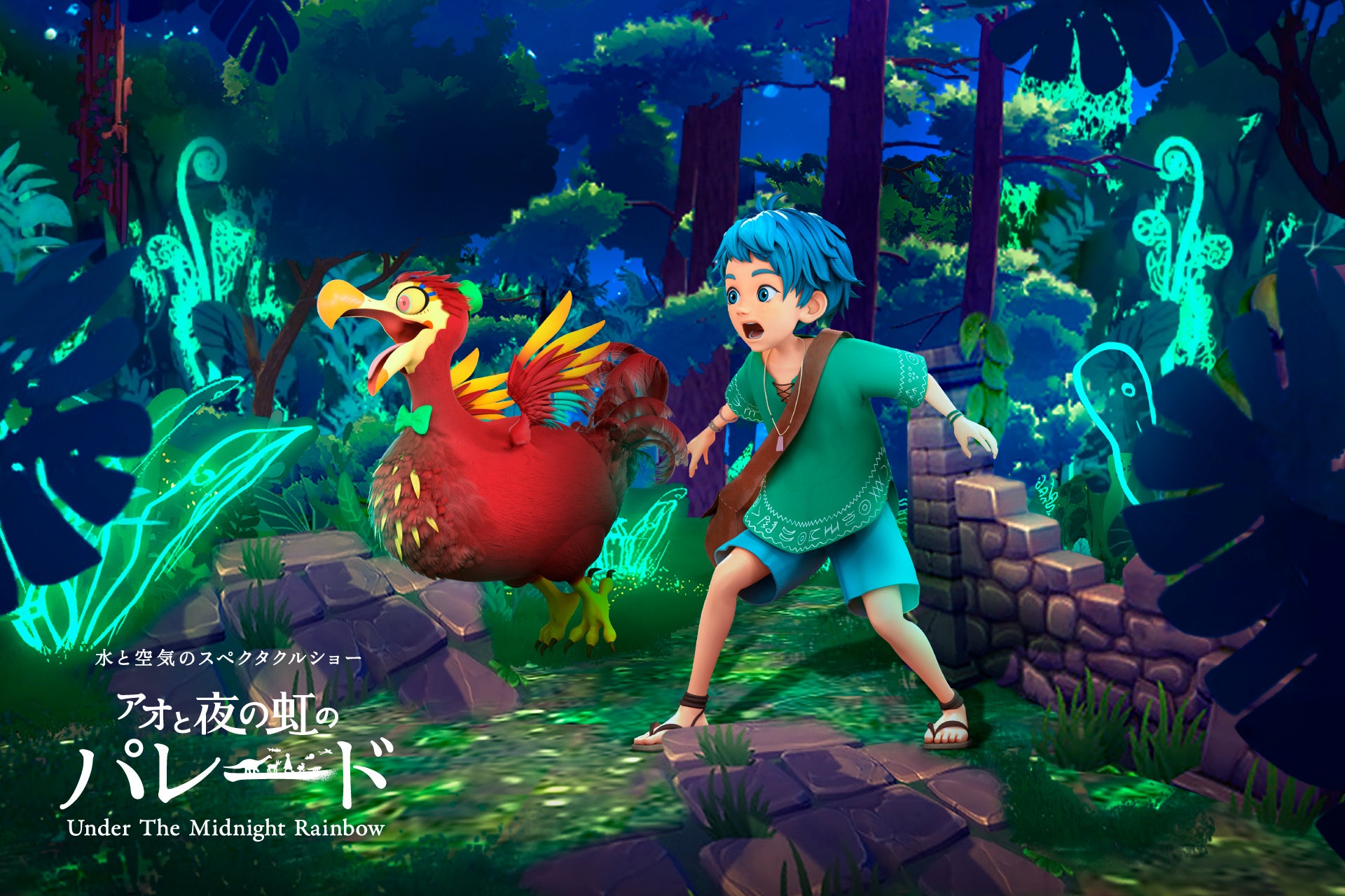 卓越した歌唱力と表現力が魅力の若手俳優、毛利 花さんを主人公の「アオ」役に抜擢。透明感溢れる伸びやかな歌声が、ショーを華やかに彩ります。また、「アオ」を祝祭へと導く「ドードー」の声を務めるのは、個性的なキャラクターを多彩に演じ分けるタレントの友近さん。関西弁の軽快なトークがユーモアと親しみを与え、物語にさらなる魅力を加えます。そして、島に伝わる歌と夜の虹の言い伝えを「アオ」に教える「おばあちゃん」の声は、夏木 マリさんが担当。物語のはじまりにおいて重要な役割を果たし、観客をショーに引き込みます。