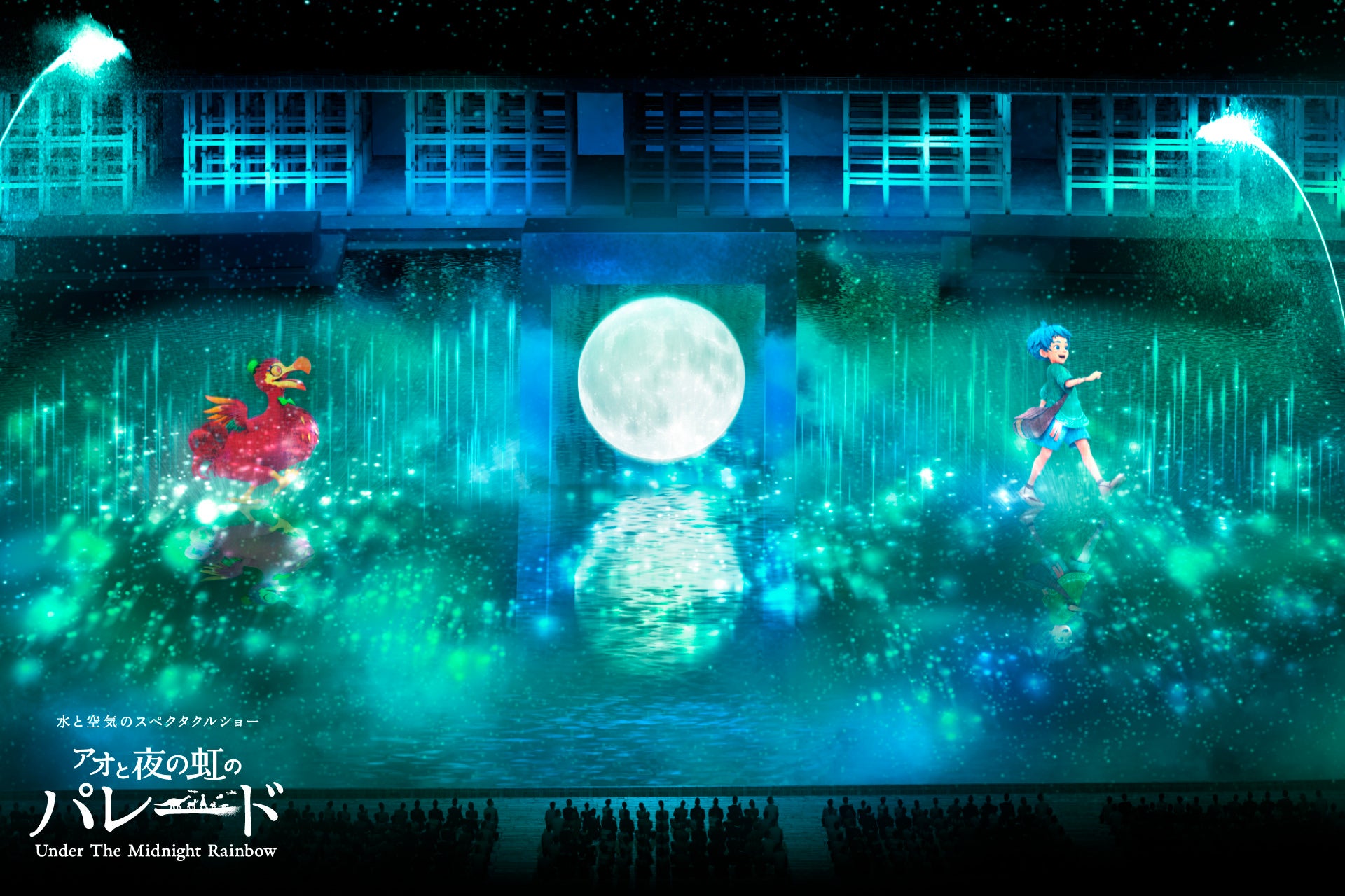 「アオと夜の虹のパレード」は、水、空気、光、炎、映像、そして音楽を駆使して、生命(いのち)の物語を壮大なスケールで描く水上スペクタクルショーです。
