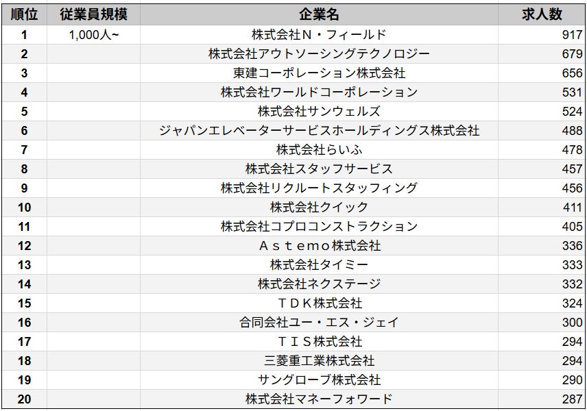 調査の結果、求人数が最も多かったのは「株式会社N・フィールド」(917件)。次いで「株式会社アウトソーシングテクノロジー」(679件)、「東建コーポレーション株式会社」(656件)と続き、人材・不動産・医療関連など幅広い業種の大手企業が上位を占めました。
