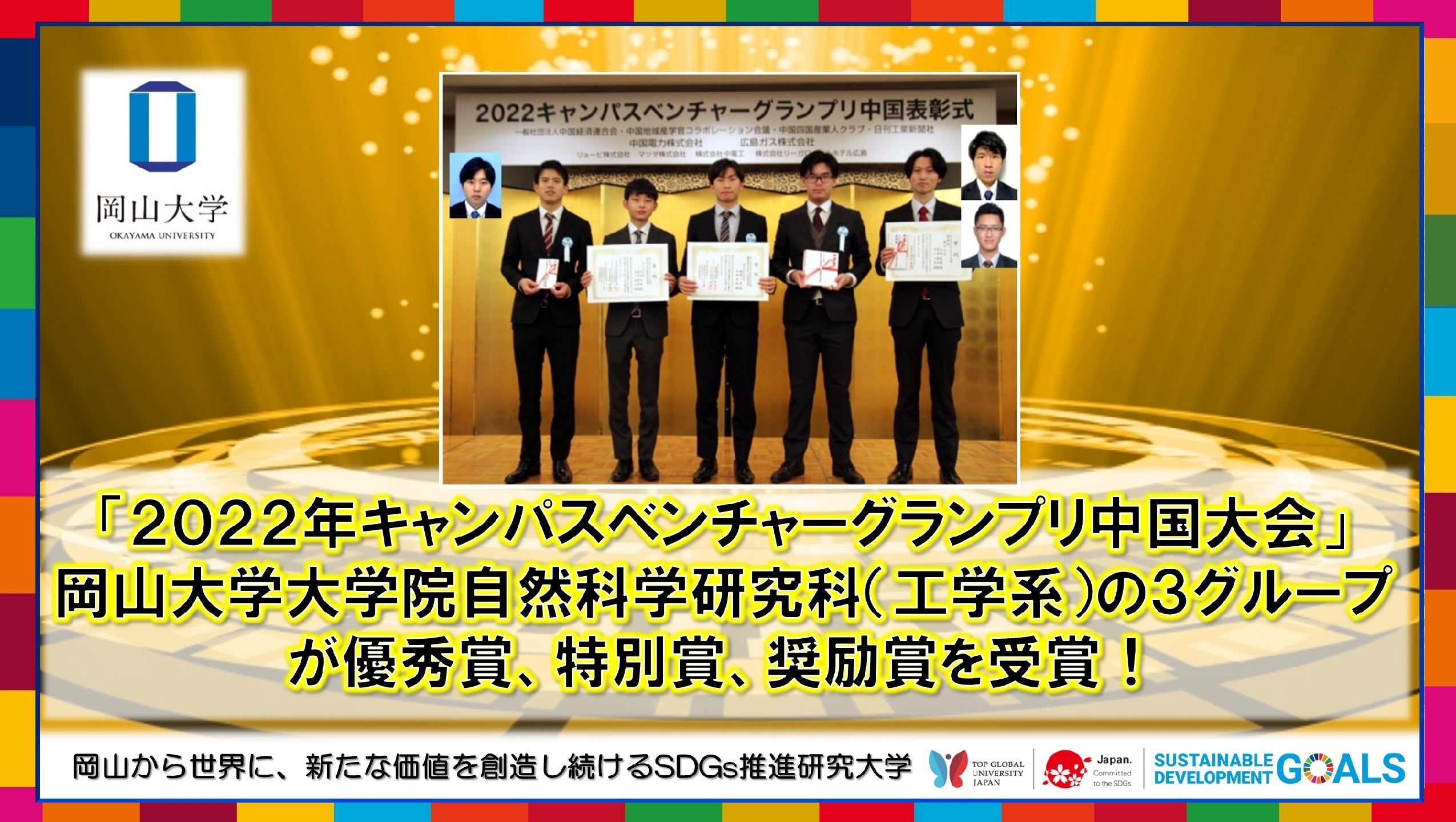 国立大学法人岡山大学(本部:岡山市北区、学長:槇野博史)の大学院自然科学研究科機械システム工学専攻の大学院生でつくる3グループが、学生起業家の登竜門として知られる「2022年キャンパスベンチャーグランプリ」の中国大会で、それぞれ優秀賞(エネルギア中国電力賞)、特別賞(中小機構中国本部長賞)と奨励賞を受賞しました。