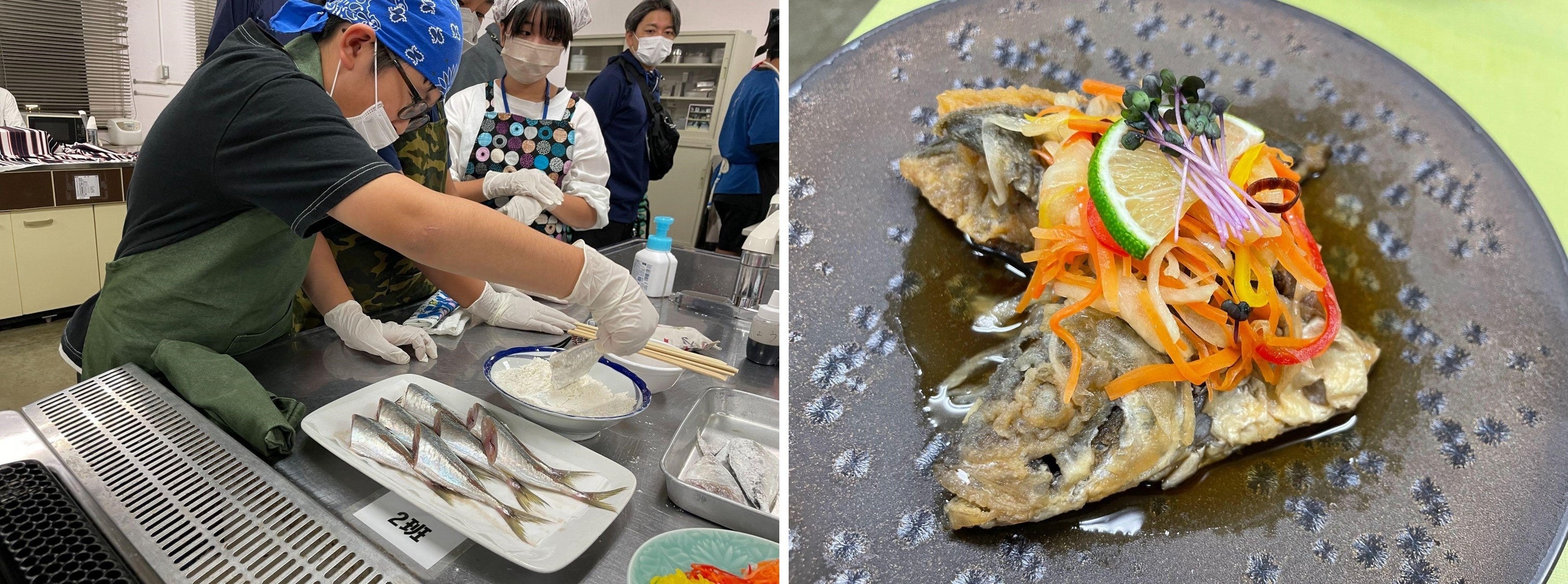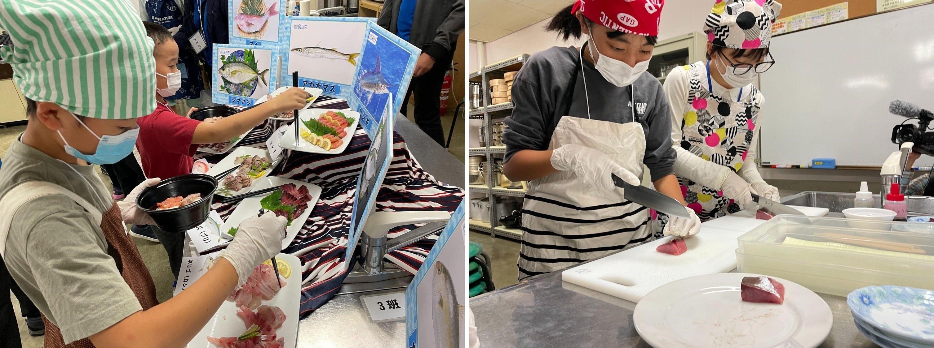 魚を捌くのも、揚げるのも初めてだった子どもたちがたくさんいましたが、シェ・デジマ坂本シェフの丁寧な指導で、楽しく調理をしていました!捌いた魚は、バイキング形式でこども達が選び取り、”マイ海鮮丼”にして美味しく頂きました。