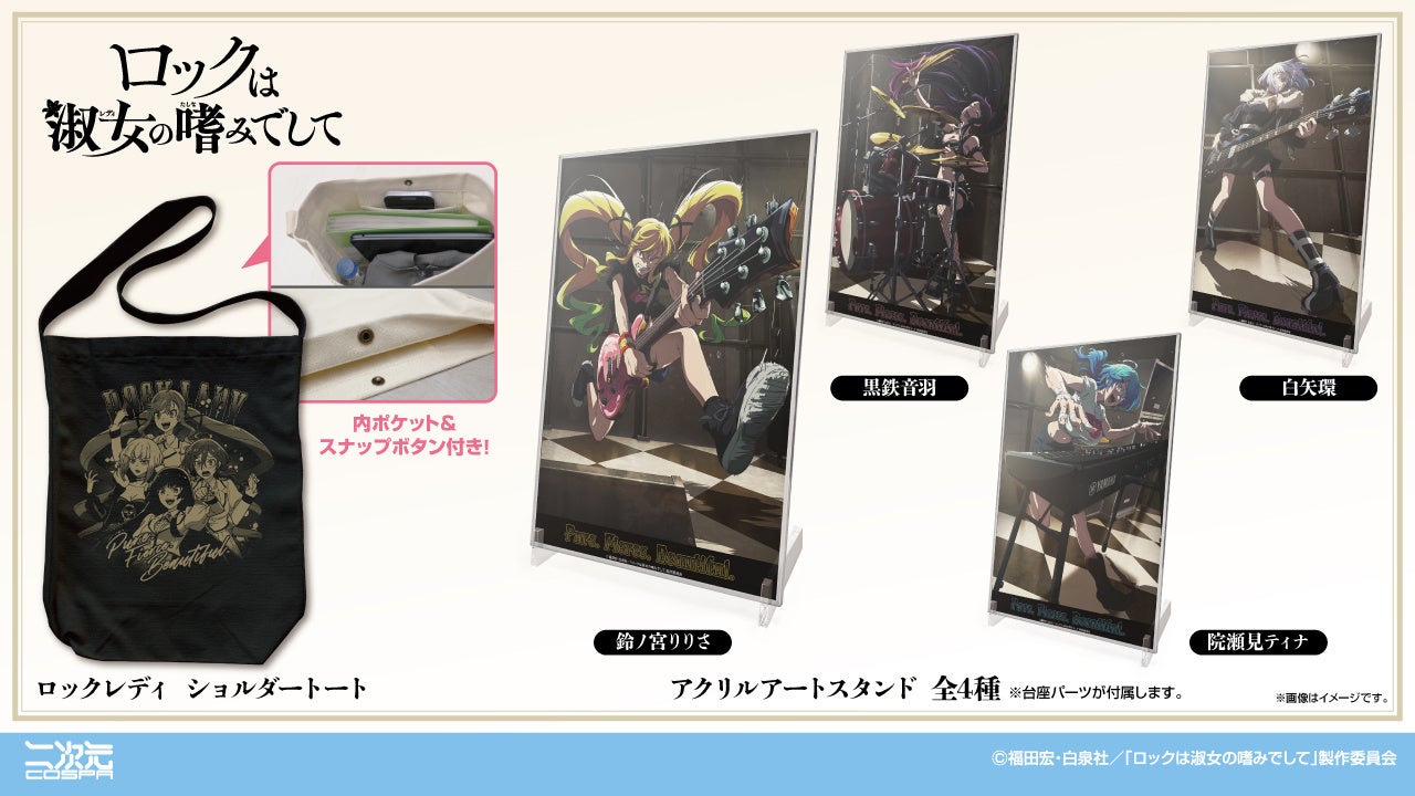 『ロックは淑女の嗜みでして』より、「鈴ノ宮りりさ」「黒鉄音羽」たちのアクリルアートスタンドとショルダートートが登場!【株式会社コスパ】