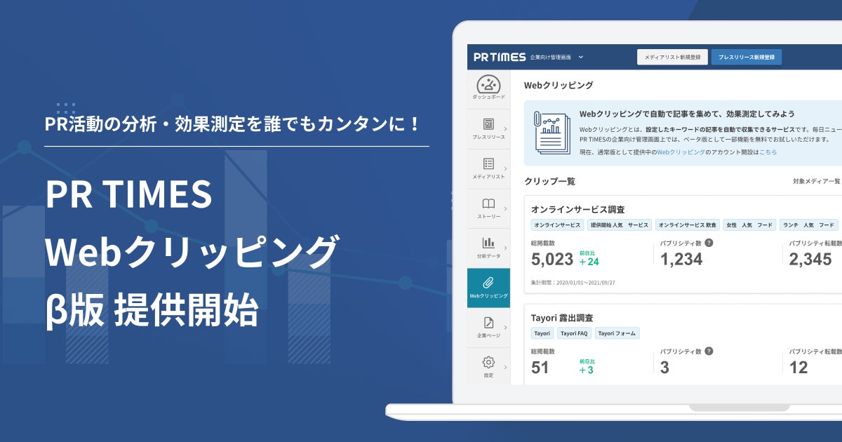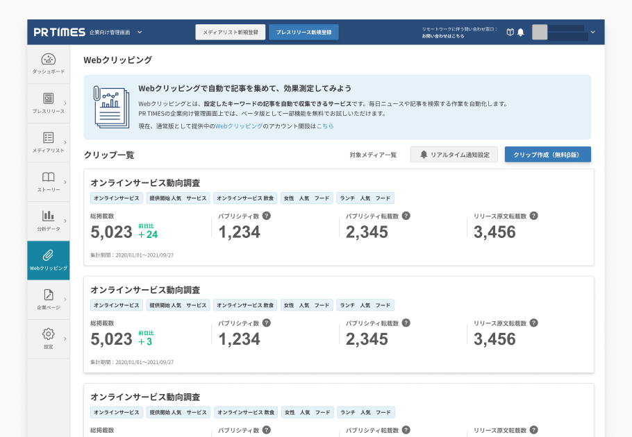 PR TIMES Webクリッピングβ版の提供を開始 プレスリリース管理画面から広報発表の成果分析が可能に