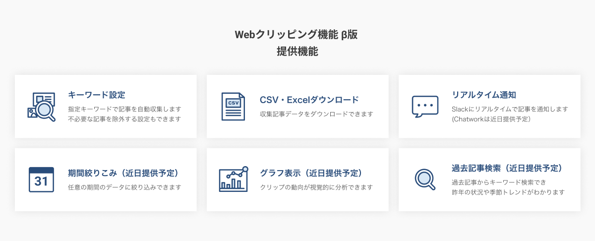 β版という中で、まだまだお客様にとってベストな機能や価値提供にはなっていない箇所もあるかもしれません。みなさまのご意見を受け止め、改善を重ねながら、5年間の歴史を持つ「Webクリッピング」を温故知新でアップデートしていけるよう尽力してまいります。