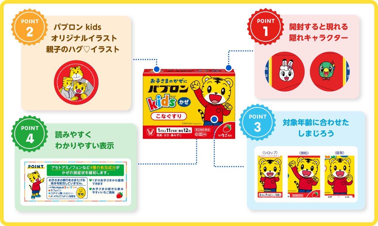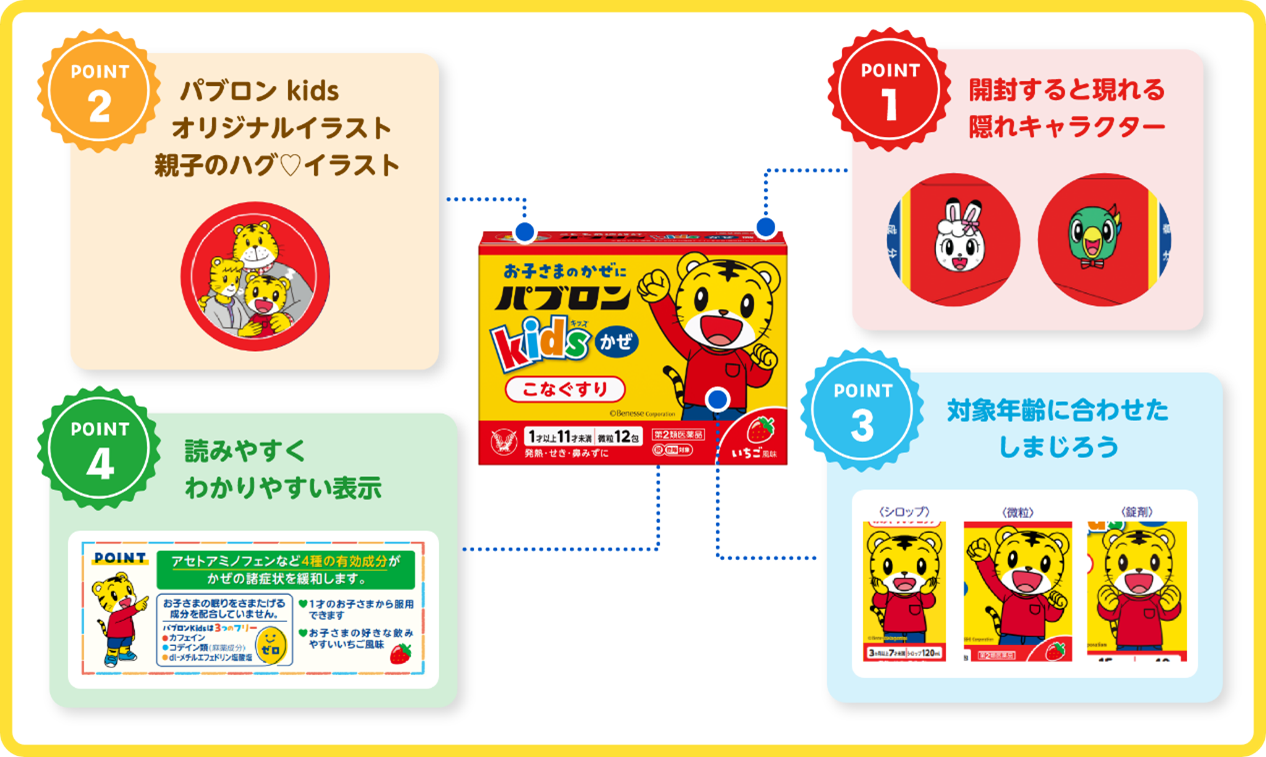 パッケージでは、しまじろうや仲間たちが、そばで見守ってくれるような気持ちになれるように、全面にイラストを取り入れ、かぜをひいたお子さまがかぜ薬を服用する抵抗感が少なくなるように工夫しています。