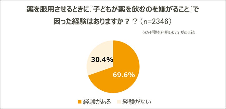 同調査から、かぜ薬の服用を嫌がるお子さまは多く、約7割の大人の方が「子どもが薬を飲みたがらない」ことに手を焼き、悩んでいることもわかりました。