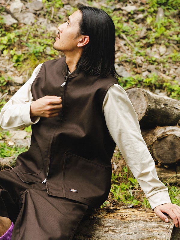 Dickiesのアーカイブから採用したアワードジャケットの襟デザインを用いたワイドフィットのフルジップアップベスト。パイピングが施された腰のパッチポケットはDickiesのワークウェアらしい特徴的なディテールです。