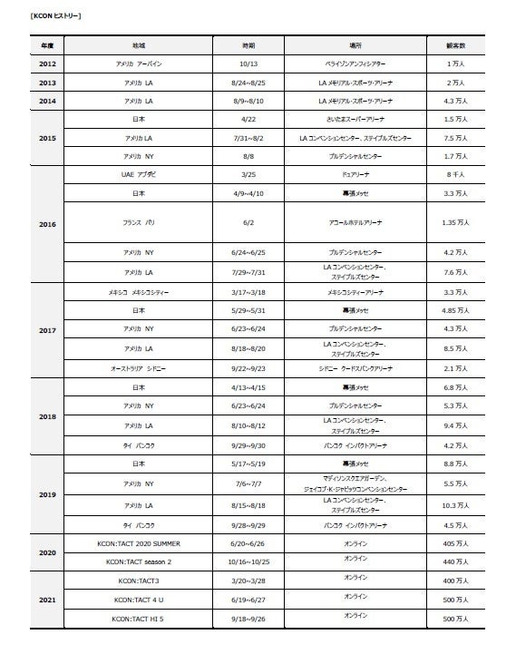 2012年にアメリカのカリフォルニアで始まったKCONは、北米、中東、ヨーロッパなど世界9都市で110万人以上の観客を集め、K-カルチャーのデジタル化を牽引する役割を果たしてきました。初年度に1万人からスタートし、直近最後の対面公演だった2019年には29万1千人余りの観客を記録するなど、実に29倍の成長を記録し、名実共にグローバルK-カルチャーフェスティバルとなりました。パンデミックにより対面公演が容易でなかった2020年からは「KCON:TACT」を通じてデジタルプラットフォームで世界中のK-カルチャーファンに会い、時間と場所にかかわらずK-カルチャーを楽しめるようにしユーザーに新しい経験を提供するとともに、非接触型フェスティバルへとさらに進化を遂げたという評価を受けました。