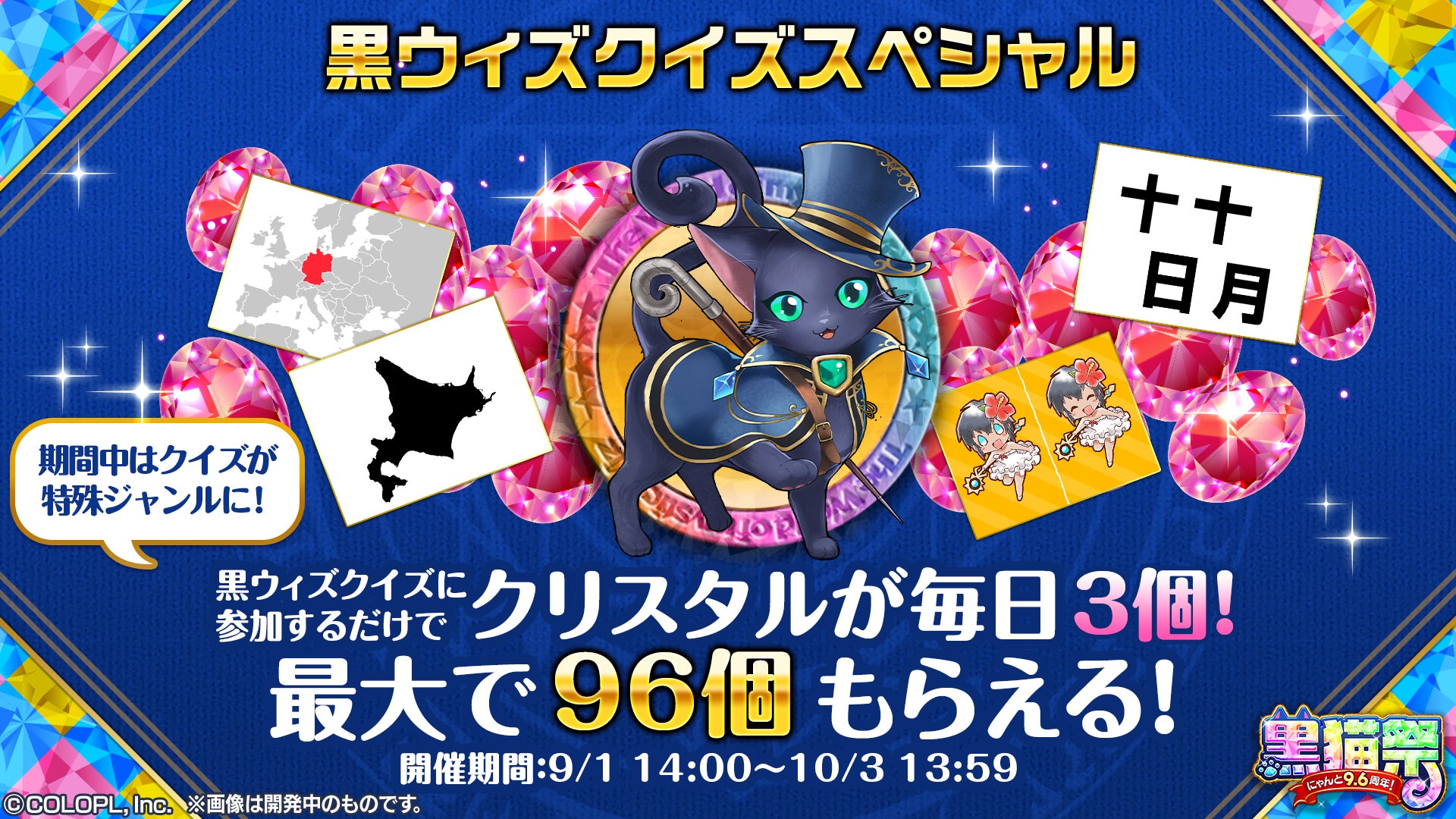 『クイズRPG 魔法使いと黒猫のウィズ』期間中毎日無料で10連ガチャを引いて最大300連分の無料ガチャ&キャラプレゼントを「黒猫祭」で実施!