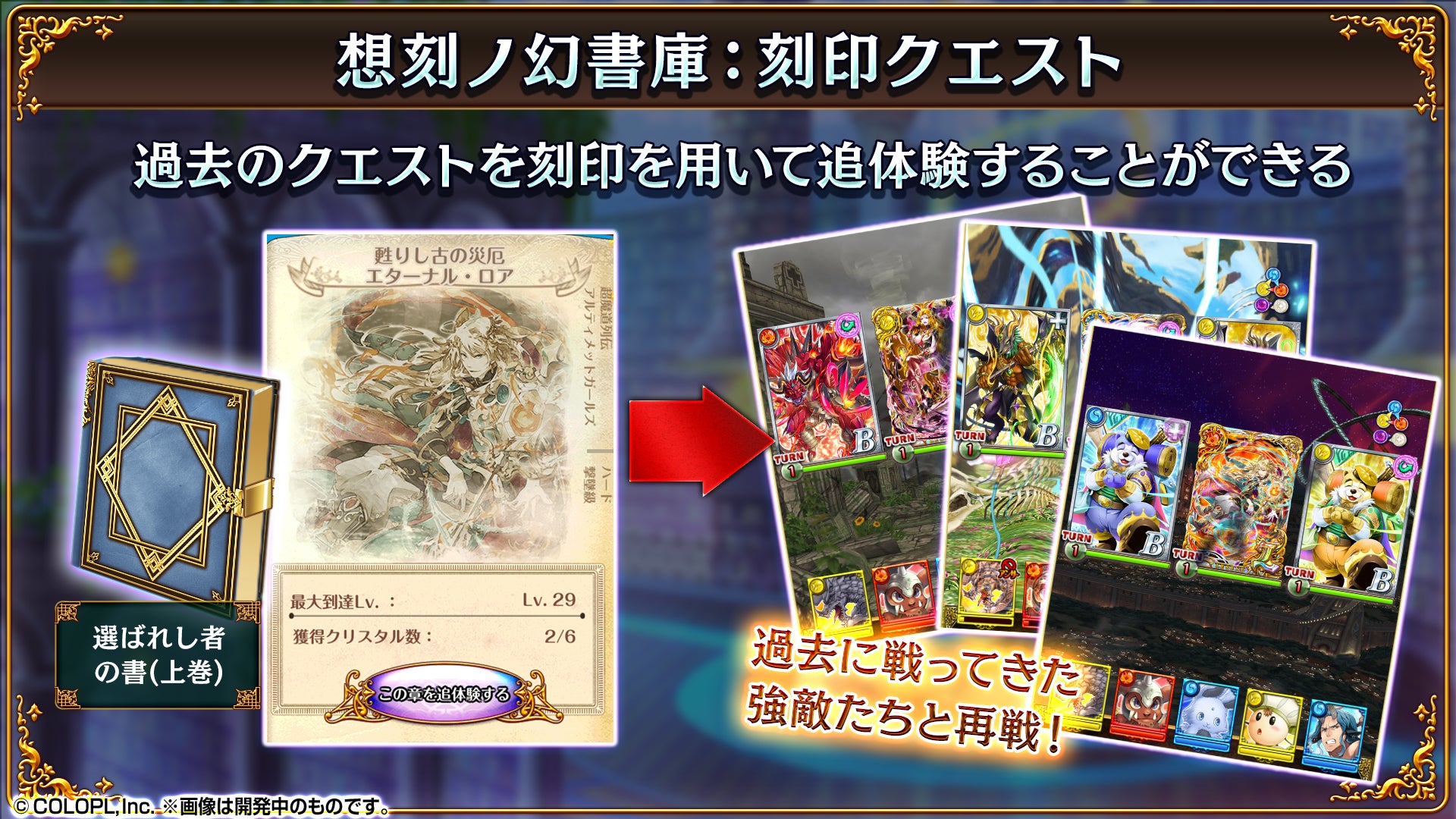 さらに、「想刻ノ幻書庫」で「刻印クエスト」というコンテンツを遊ぶことができます。過去に異界で繰り広げられた数々の戦いに再度チャレンジしていく新コンテンツとなっており、刻印を付与してクエストの難易度を調整することで自分の限界にチャレンジすることができます。