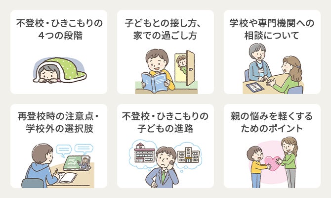 子どもの不登校・ひきこもりに関する基本的な知識や、さまざまな場面に対応したサポート方法が体系的にやさしく学べます。
