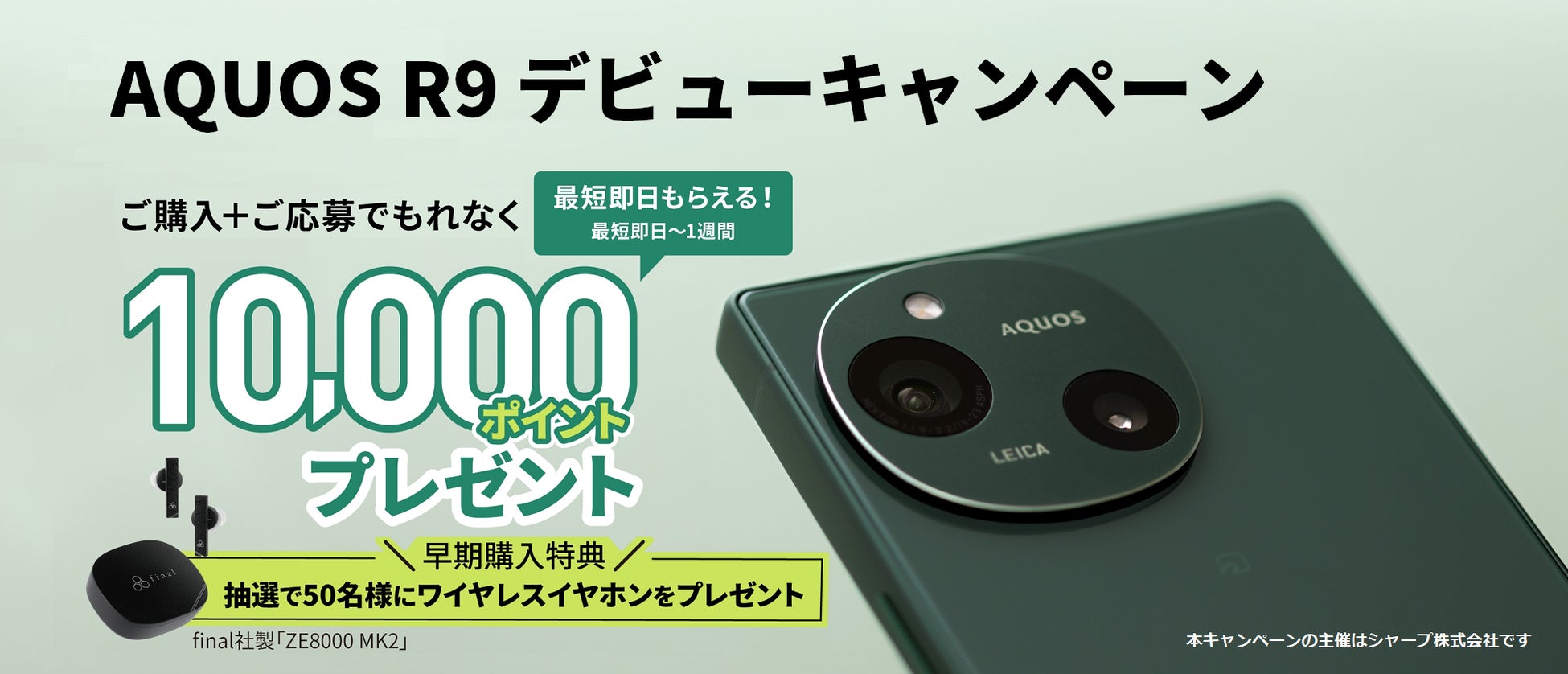 7月12日(金)~9月1日(日)の期間中に、NTTドコモまたはソフトバンクの「AQUOS R9」をご購入の上、キャンペーンサイトからご応募いただいたお客様にもれなく、10,000ポイント(dポイント/PayPayポイントのいずれか)をプレゼントします。さらに、7月31日(水)までに本キャンペーンにご応募いただいた方の中から抽選で50名様に、「Qualcomm(R) Snapdragon Sound™」対応のfinal社製ワイヤレスイヤホン(ZE8000 MK2)をプレゼントします。