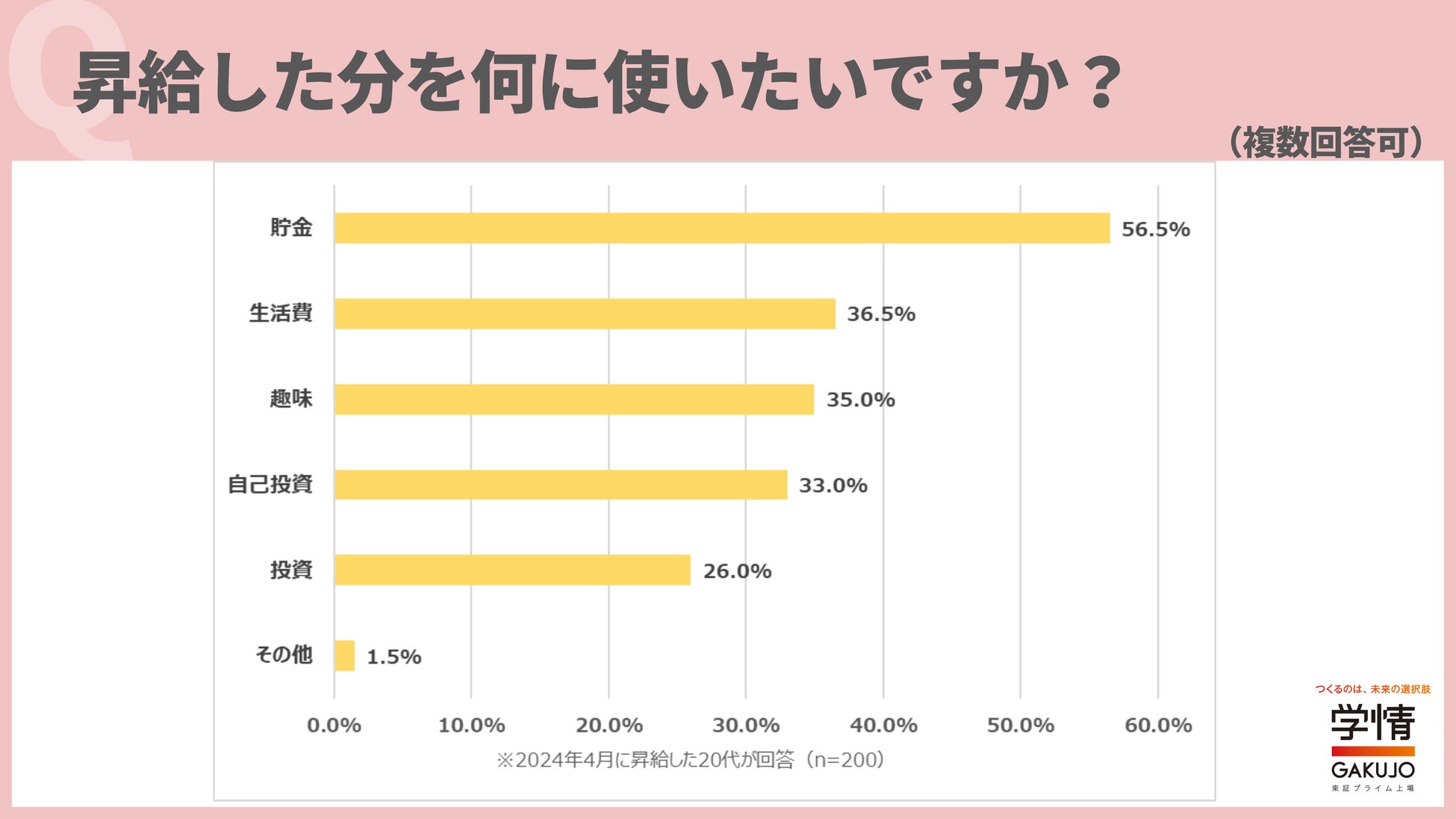 2024年4月に昇給した20代に、「昇給した分の使い道」を聞いたところ、「貯金」が56.5%で最多となりました。次いで、「生活費」36.5%、「趣味」35.0%、「自己投資」33.0%が続きます。「貯金があったほうが、選択肢が拡がると思う」「結婚や出産に備えて、貯金をしておきたい」「都内で1人暮らしをすると、なかなか貯金が難しい。昇給分も生活費に使う予定」「20代のうちは、趣味も含めて様々なことを経験したい」「スキルや知識は自分の財産になる」「自己投資をすると、さらに年収アップにつながると思う」などの声が寄せられました。