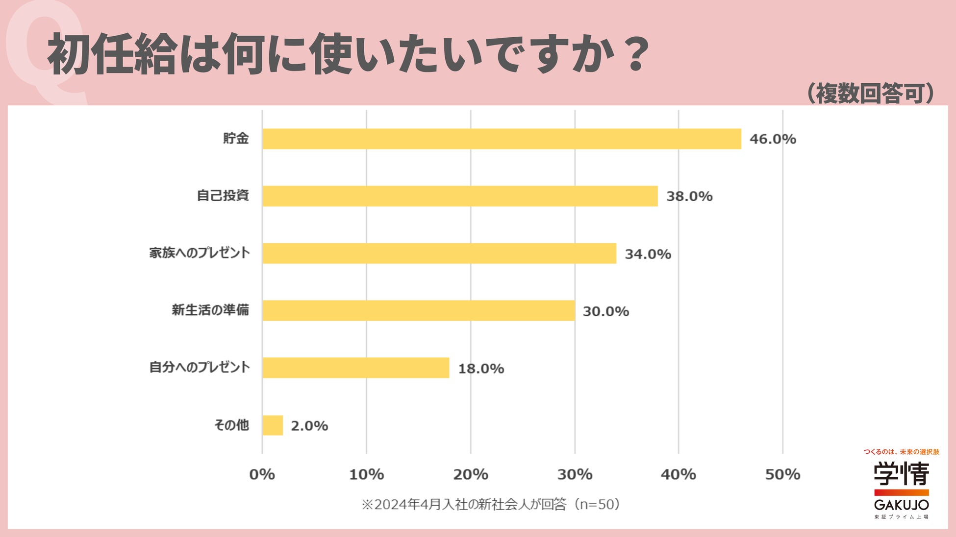 初任給の使い道は、「貯金」46.0%が最多。次いで、「自己投資」38.0%、「家族へのプレゼント」34.0%が続きました。「社会人1年目から貯金を始めておきたい」「仕事で活躍できるように、スキル習得や資格取得を頑張りたい」「お世話になった家族に感謝の気持ちを伝えたい」などの声が寄せられています。