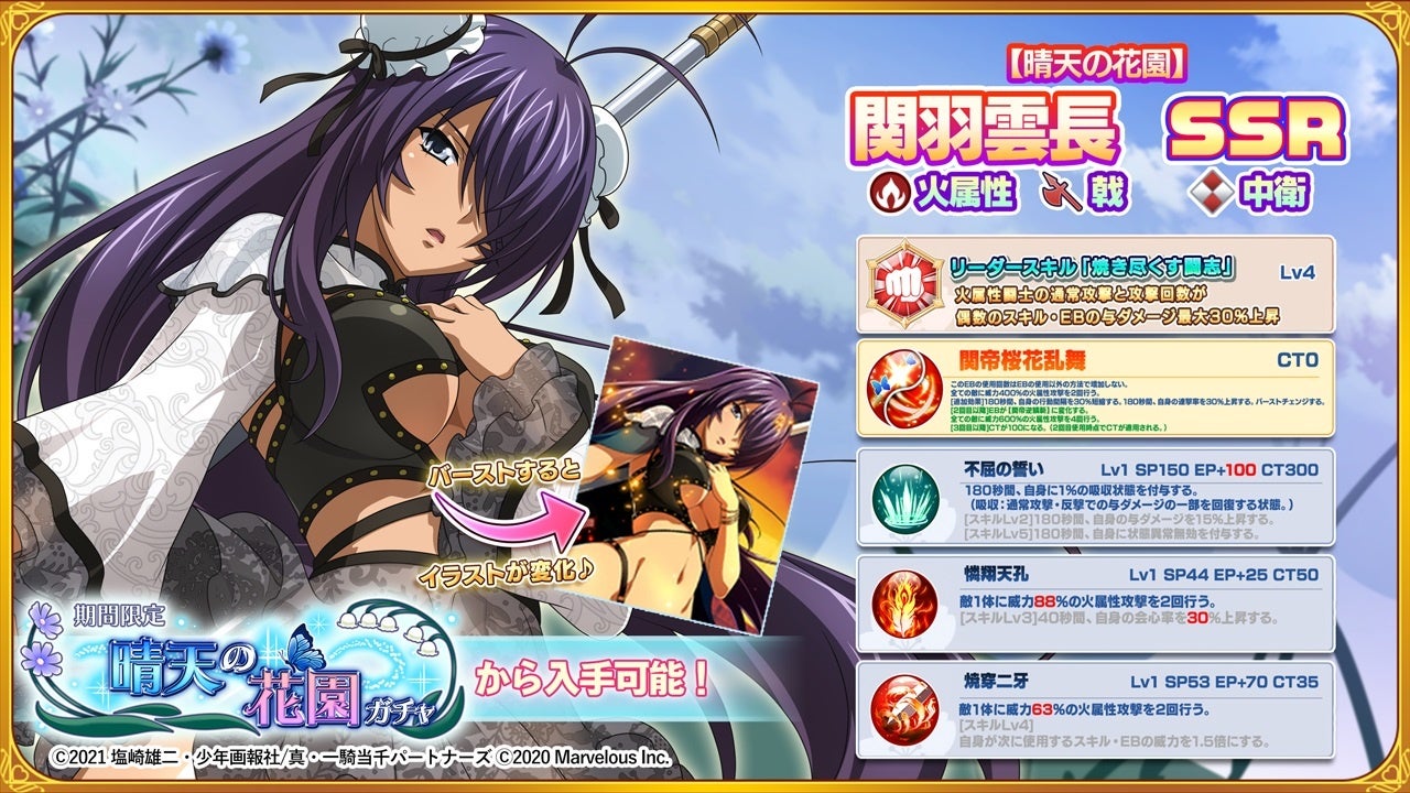 本日から始まる「バーストフェス「晴天の花園」ガチャ」では「【晴天の花園】関羽雲長」が登場!