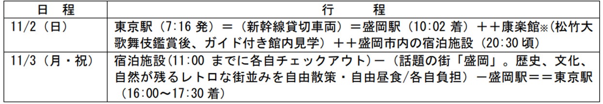 2)行程:(==新幹線 ++貸切バス --お客様負担)