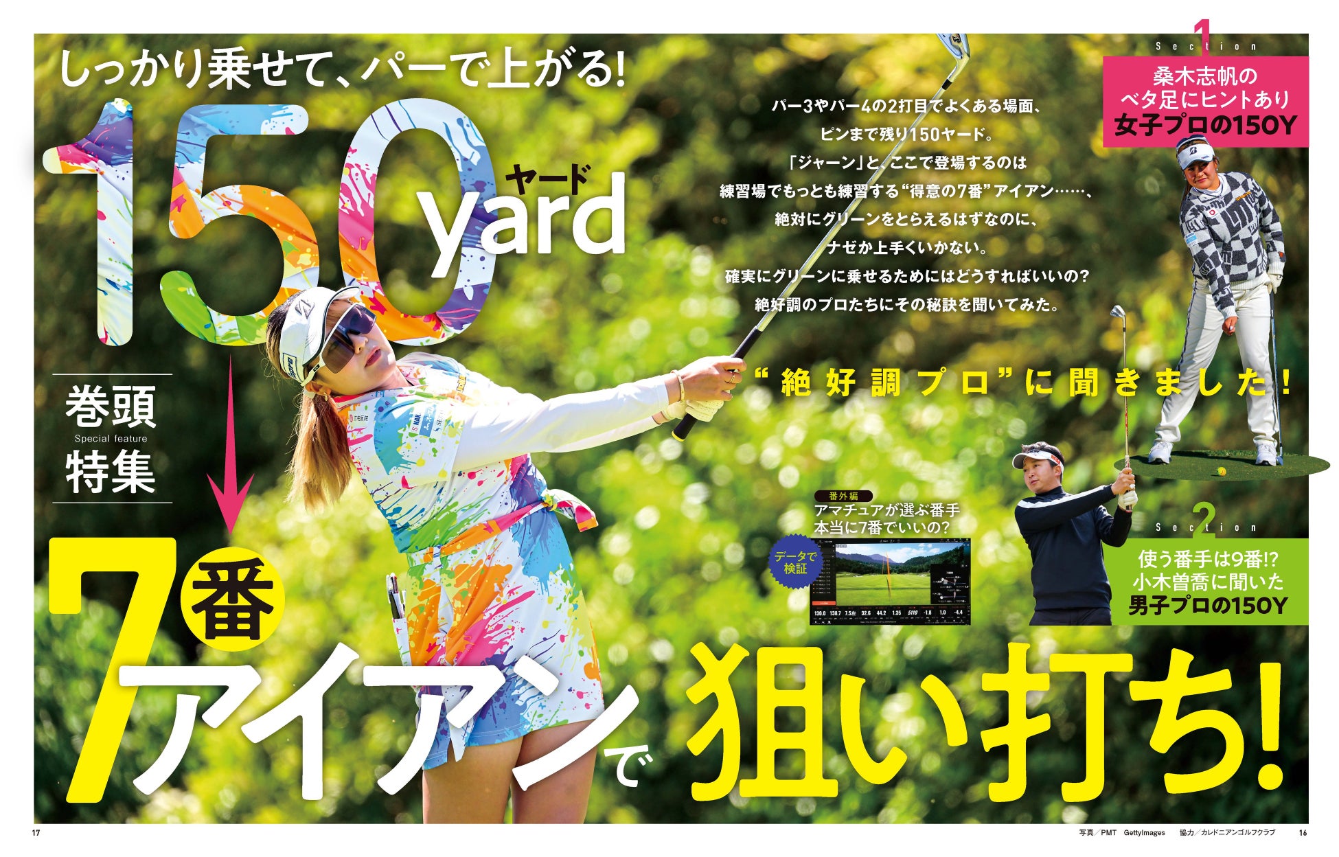 巻頭特集は「7番アイアンで150ヤードを狙い打ち」。アマチュアゴルファーのひとつ基準である「7番150ヤード」。確実にグリーンに乗せるにはどうすればいいのか? 昨シーズン3勝して大ブレイクした女子プロ・桑木志帆に打ち方、攻め方の基本を教わります。その秘訣は桑木の特徴でもある「ベタ足」にあるのかも?