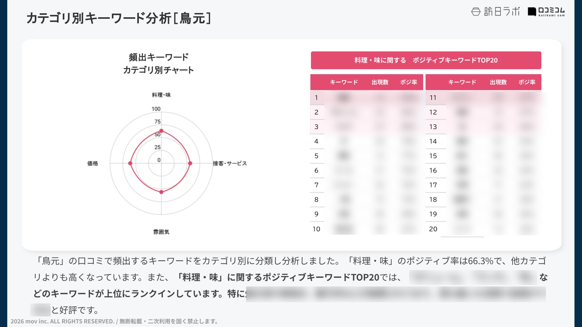 また。両ブランドの口コミに頻出するキーワードをカテゴリ別(料理・味 / 雰囲気 / 価格 / 接客・サービス)に分析し、「料理・味」のカテゴリでのポジティブキーワードTOP20も発表しています。