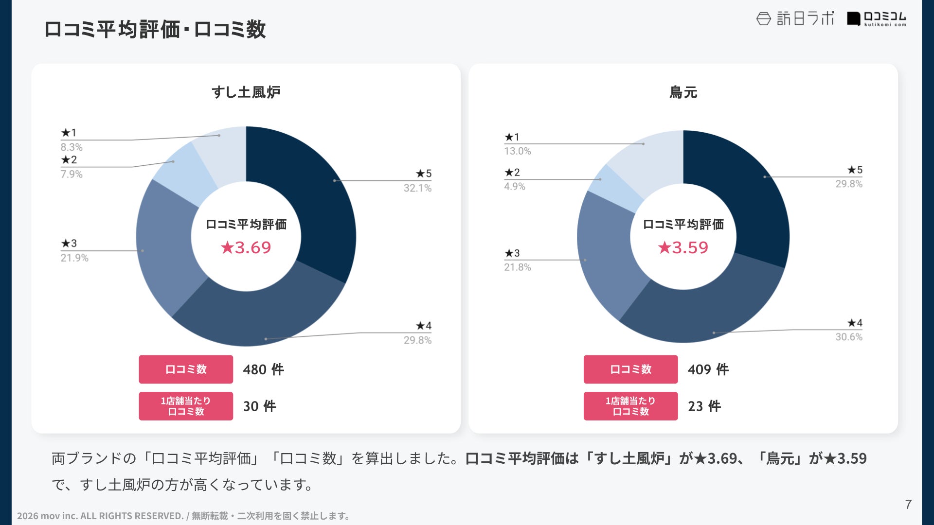 「すし土風炉」16店舗・「鳥元」18店舗の「口コミ平均評価」「外国語口コミ率」「ポジティブキーワード」を調査