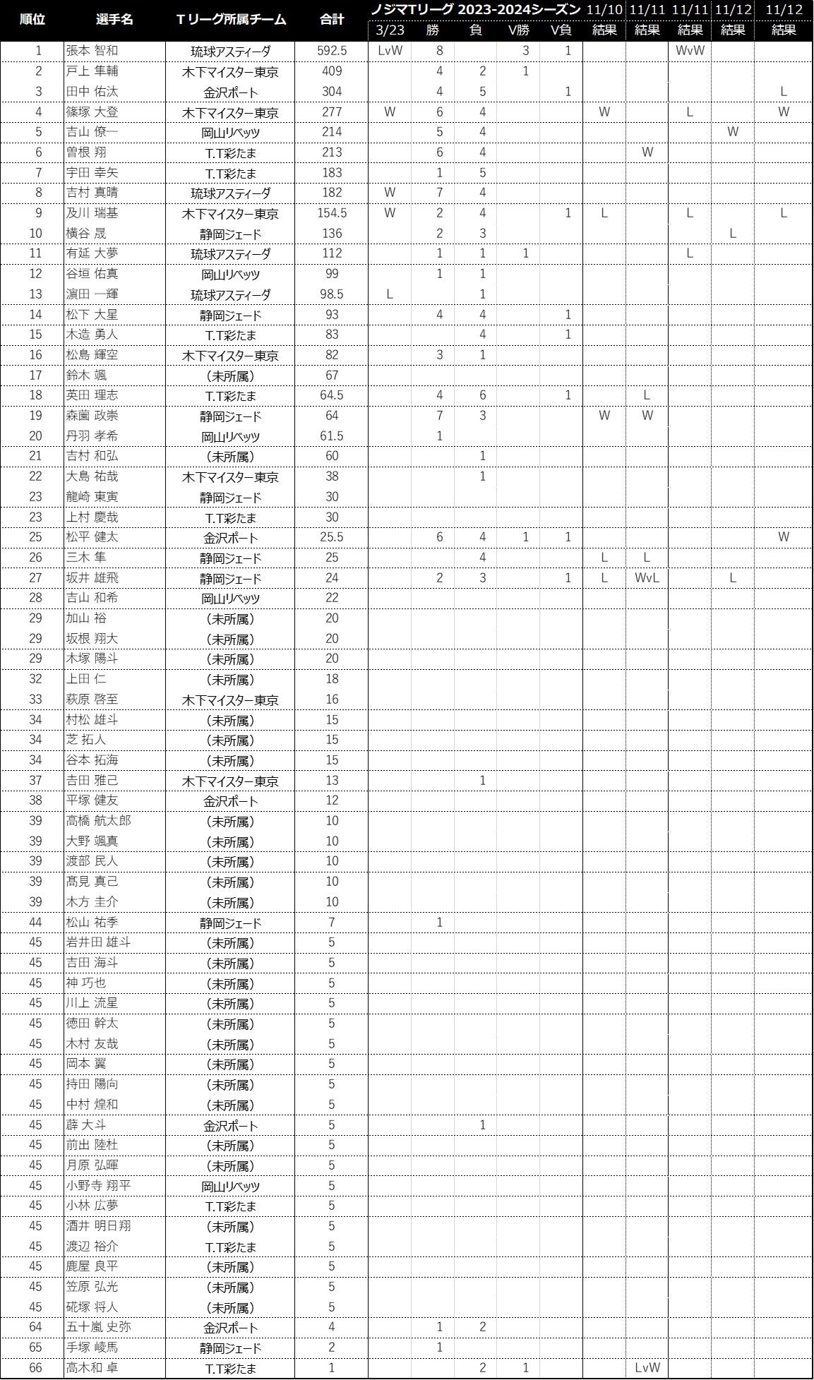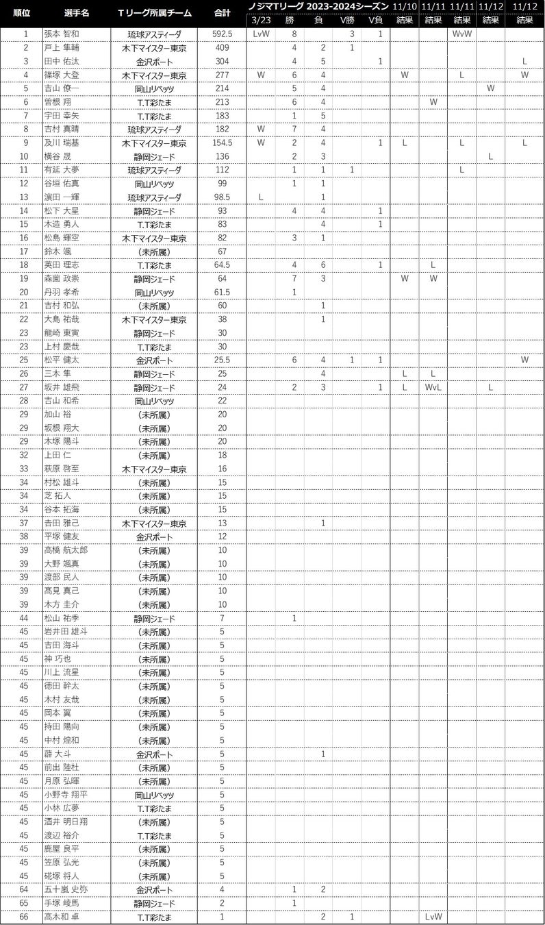 ノジマTリーグ 2023-2024シーズンにおける、「2024パリオリンピックシングルス選考ポイント 」の獲得状況をお知らせします。(ノジマTリーグ 2023-2024シーズン公式戦 11/12開催試合終了時)