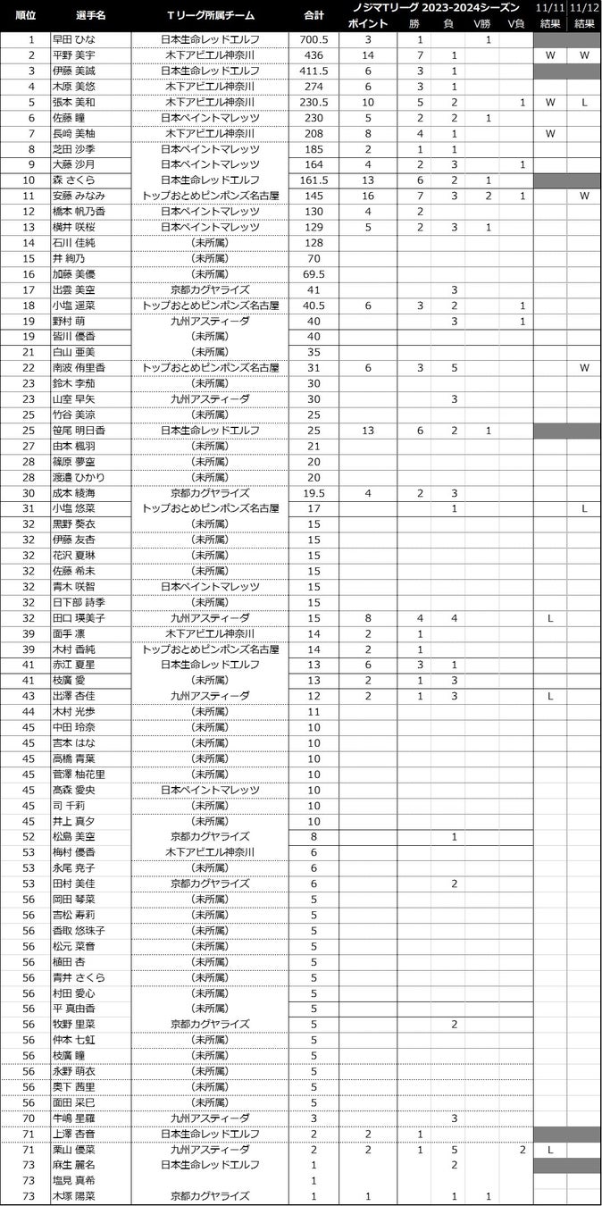 ノジマTリーグ 2023-2024シーズン 2024パリオリンピックシングルス選考ポイント 獲得状況 (11/12 開催終了時)
