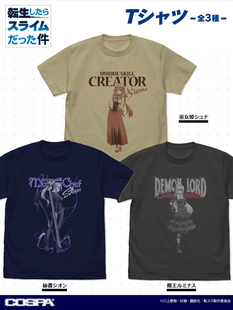 『転生したらスライムだった件』より、「巫女姫シュナ」「秘書シオン」「魔王ルミナス」それぞれのTシャツがCOSPA(コスパ)から登場!