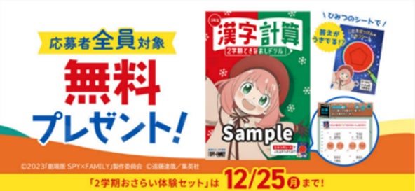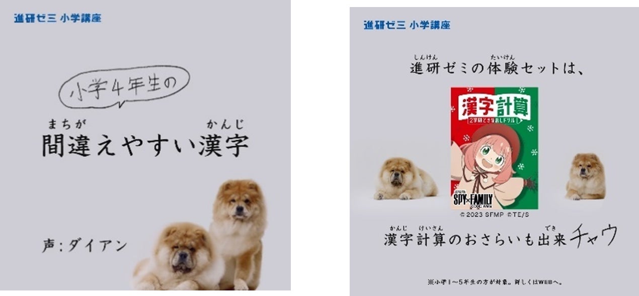 また、CMではテレビアニメ「SPY×FAMILY」とタイアップし、楽しく2学期のおさらいができる「漢字計算とき直しドリル」も含んだ体験セットの無料プレゼントをご紹介します。チャウチャウ犬がかわいらしくおさらいの大切さを伝える「ついつい間違えチャウ漢字」篇をSNSでも配信し、「進研ゼミ小学講座」は、小学生の冬の楽しい学習を応援いたします。