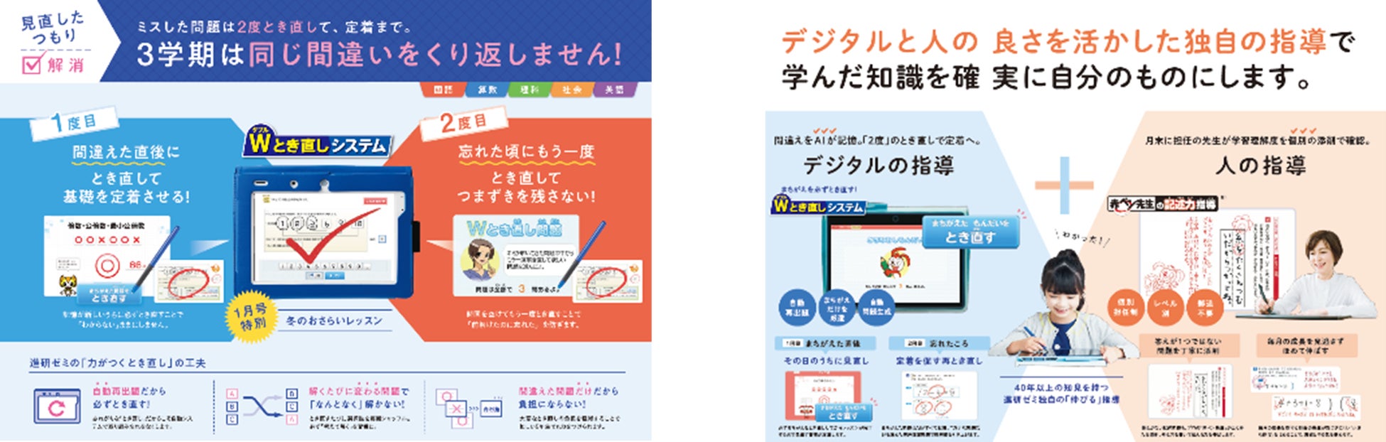 40年以上の知見を持つ進研ゼミならではの「伸びる」指導。デジタルの指導では、間違いをAIが記憶し「2度」のとき直しでつまずきを残しません。また、担任制”赤ペン先生”の個別の添削により、学んだ知識を確実に定着させる指導となっています。