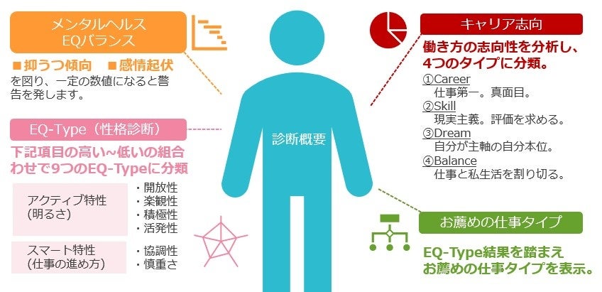 ワークスアイディが提供する、人材のキャリア志向とEQ-typeから仕事の適性を診断する適性検査をご利用いただけます。キャリア志向診断と性格診断により、応募者の志向性を明確にし、採用後の戦力化まで見据えて活用いただけます。