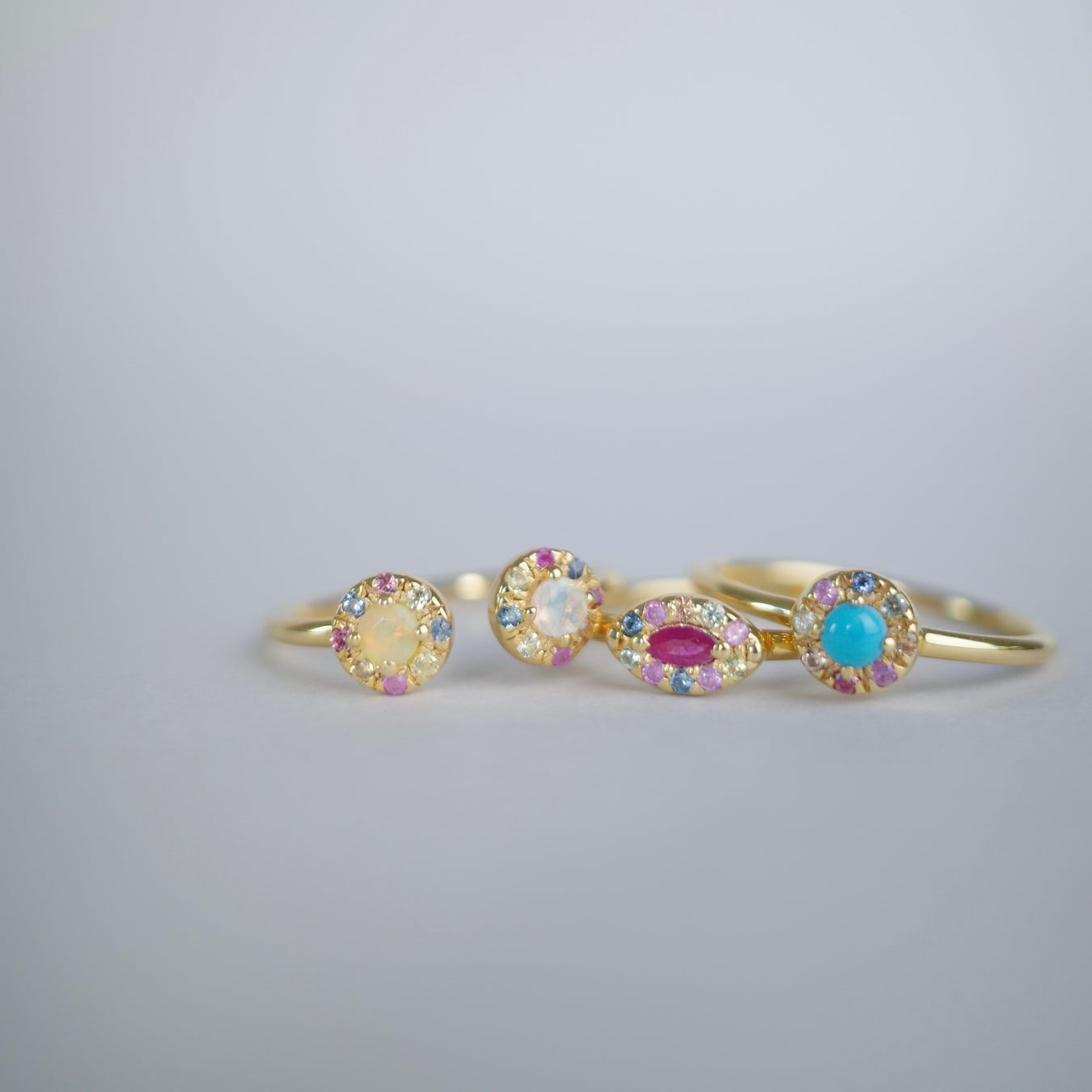 虹色の遊色効果を発するオパール、ピンクがかった深紅の発色が美しいルビー、青空のようなブルーのターコイズ。その周りを強い輝きを放つ、マルチカラーのサファイアで贅沢に取り巻いたリング。