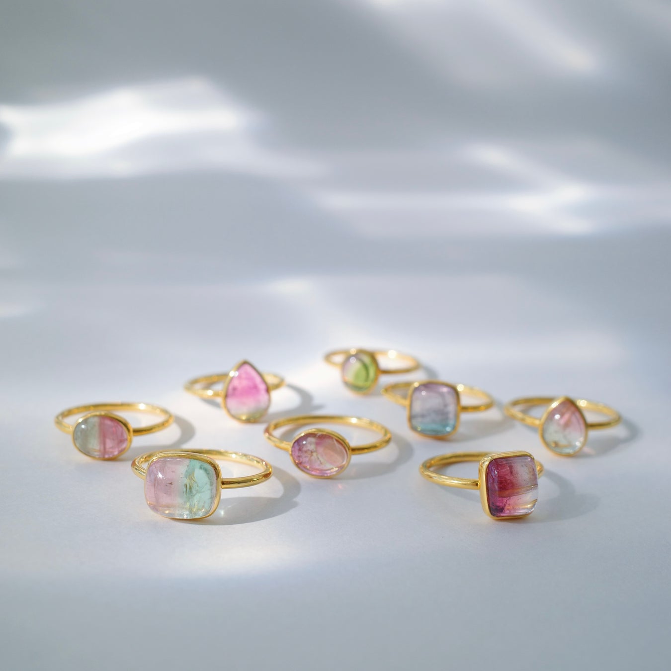 その美しい情景を彷彿とさせるようなバイカラートルマリンを、色や形の異なる1点もののリングに仕上げました。