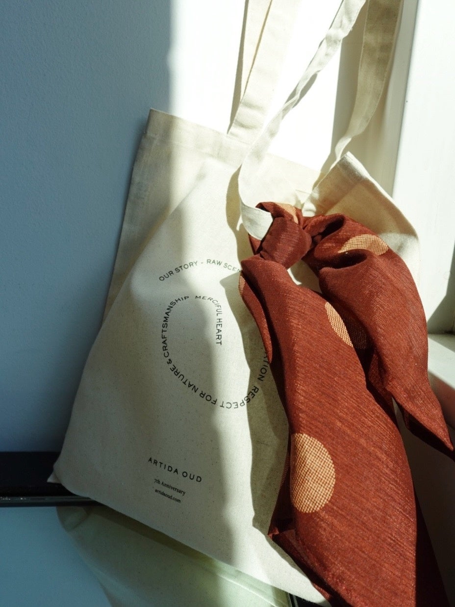 税込11,000円以上お買いあげの方に、先着でARTIDA OUDオリジナルトートバッグとバンダナをプレゼント。