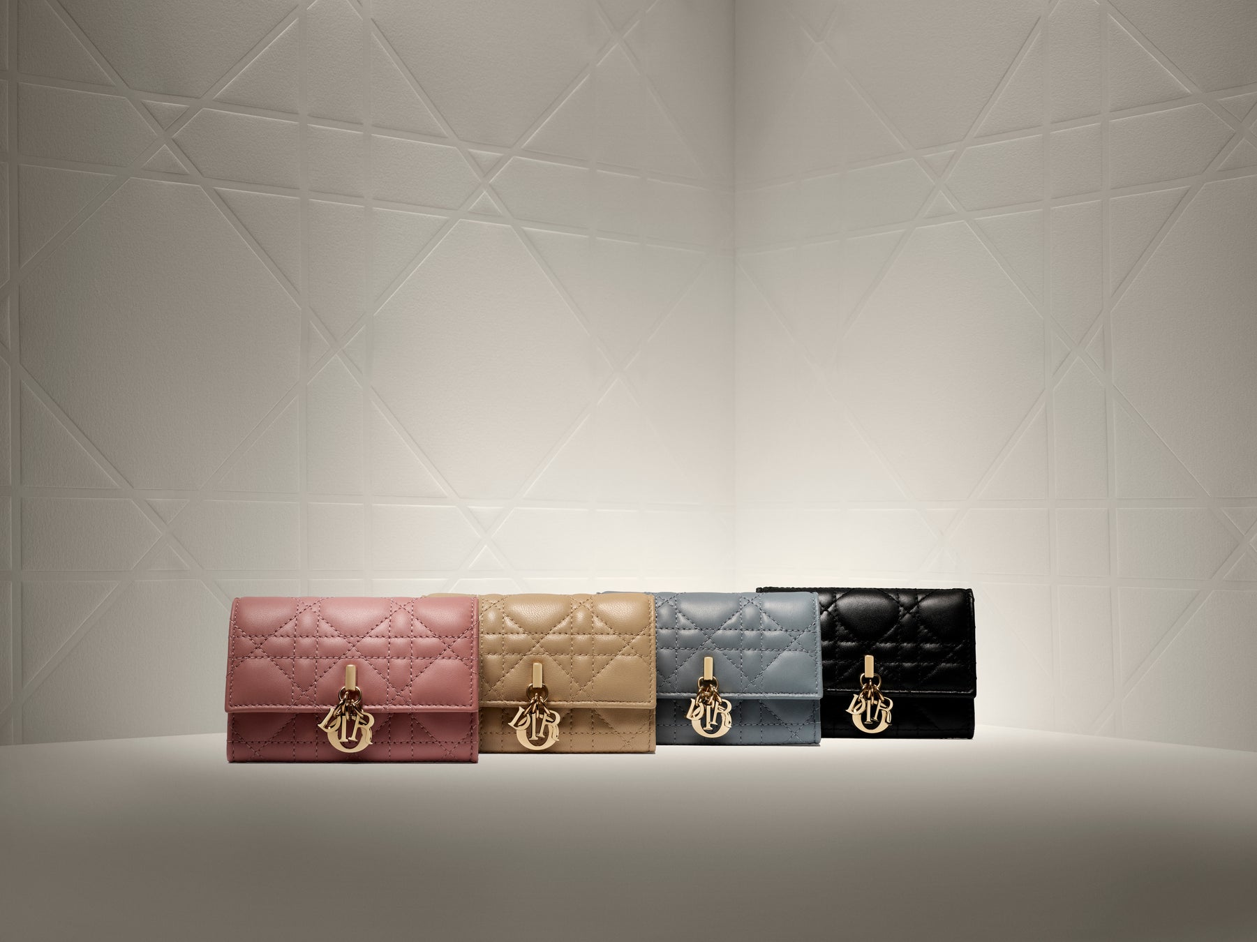 「カナージュ」ステッチが施されたパテントが華やかな「レディ ディオール」“Voyageur”ウォレットは、さわやかなプラシッドブルーや日本限定のアンティークピンクといった繊細なパステルトーンを纏い、取り外し可能な“D.I.O.R.”チャームがアクセント添えます。