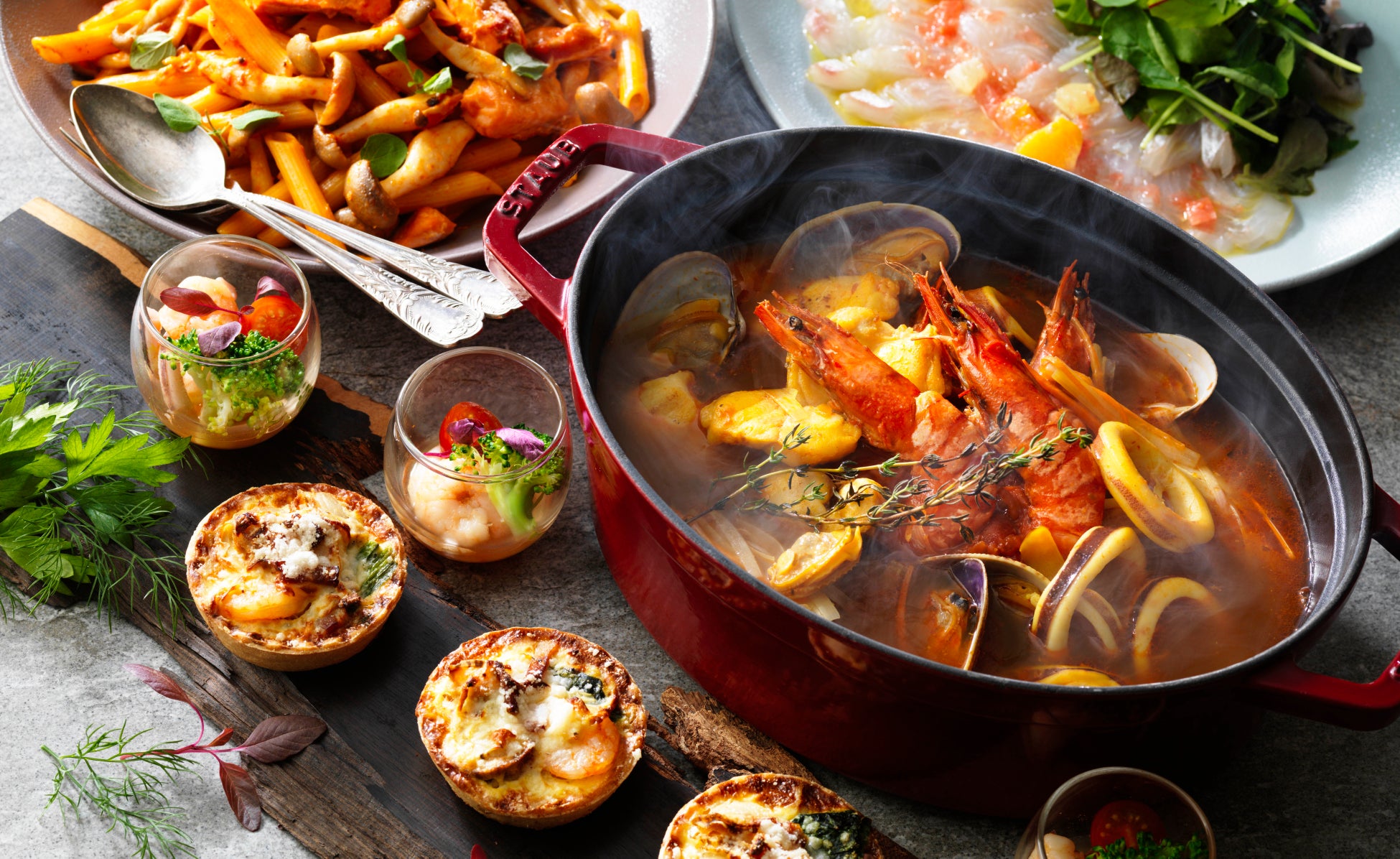 12月3日~1月31日の期間中、北海道の美味しい海鮮メニューをたっぷりとご提供する「北海道シーフードフェア」を「オールデイダイニング アトリウム」にて開催いたします。12月は「北海道ブイヤベース」を、1月は「北海道アクアパッツァ」を主役とした月替わりのシーフードメニューを各種ご用意。12月の「北海道ブイヤベース」は、シェフが厳選したアンコウ、アサリ、イカ、トマト、海老などの魚貝をたっぷりと使い、それぞれの素材の旨味がスープに凝縮、冬の冷えた体を温めます。他にも、ボイルズワイガニ、シーフードセビーチェ、エビとホタテのキッシュ、サーモンのトマトクリームペンネなどをご用意いたしております。