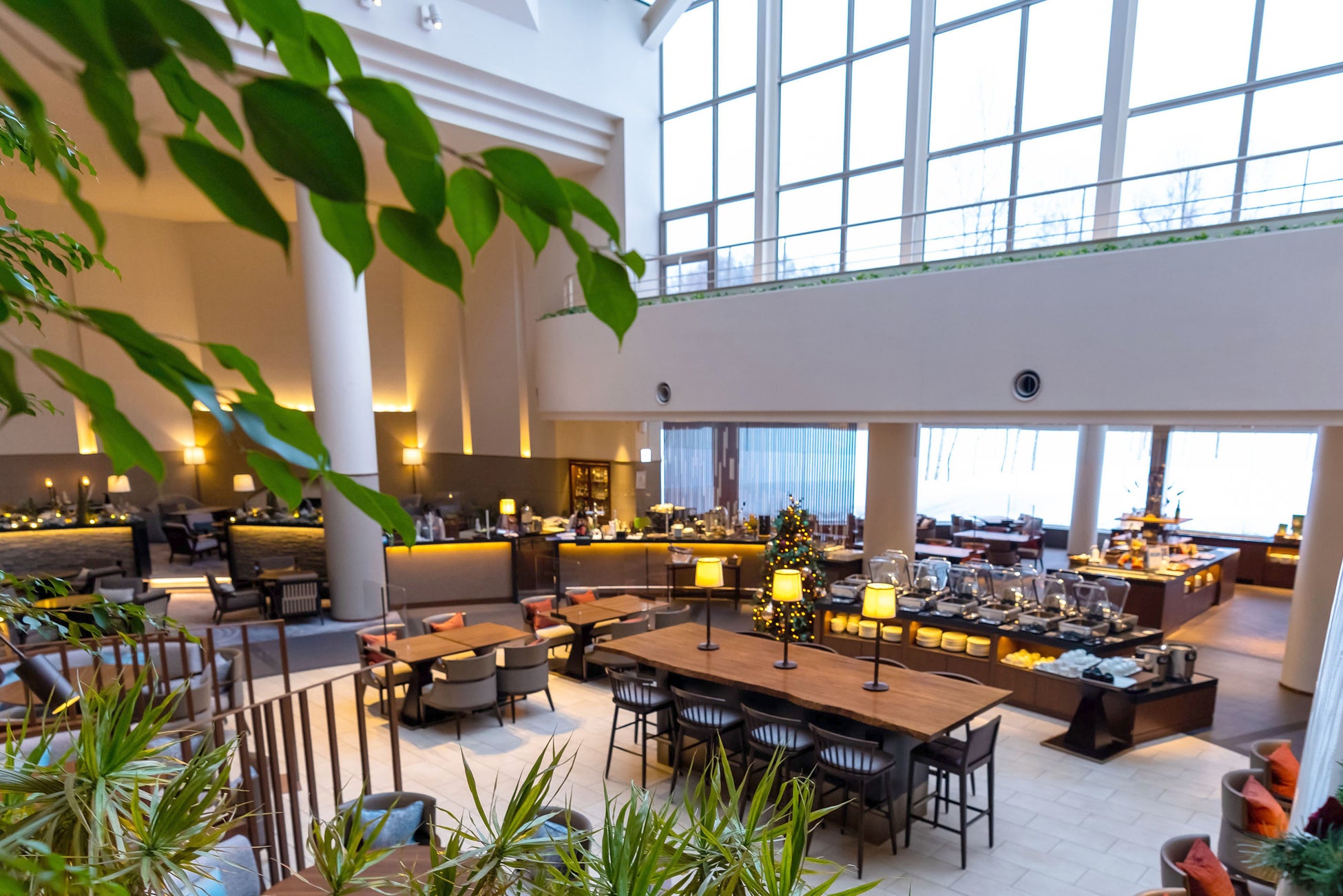 ウェスティン ルスツリゾート1階のレストラン「オールデイダイニング アトリウム」では、大きな窓から冬景色を眺めながら終日お食事をお楽しみいただけます。夕食ではシーフードフェアを、ランチではクリスマス限定のオリジナルメニューをご用意しております。