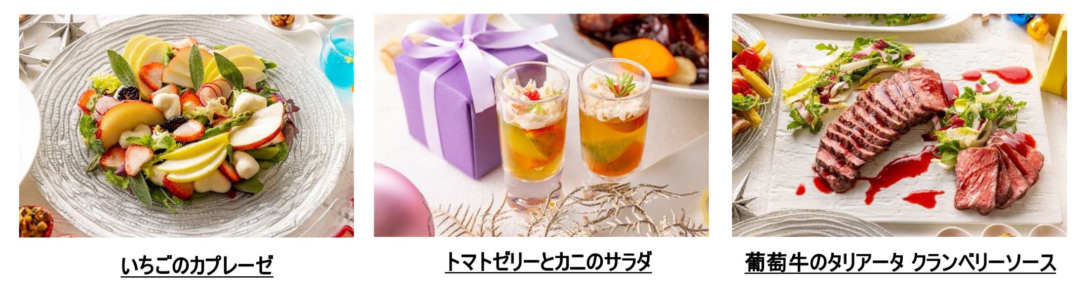 本イベントでは、ワクワクするクリスマスシーズンをさまざまなカラーで魅せるビュッフェメニューを取り揃えております。カラフルなミニトマトをゼリーに仕立てカニの塩味と合わせた「トマトゼリーとカニのサラダ」や甘さと酸味のバランスがよいいちごを使用し、花畑のような見た目も可愛らしい「いちごのカプレーゼ」に加え、肉の赤色にクランベリーソースが映える「葡萄牛のタリアータ」、サーモンのオレンジ色にブラウンのソースがアクセントになった「サーモンのベイク キャフェドパリバターソース」などをお楽しみいただけます。