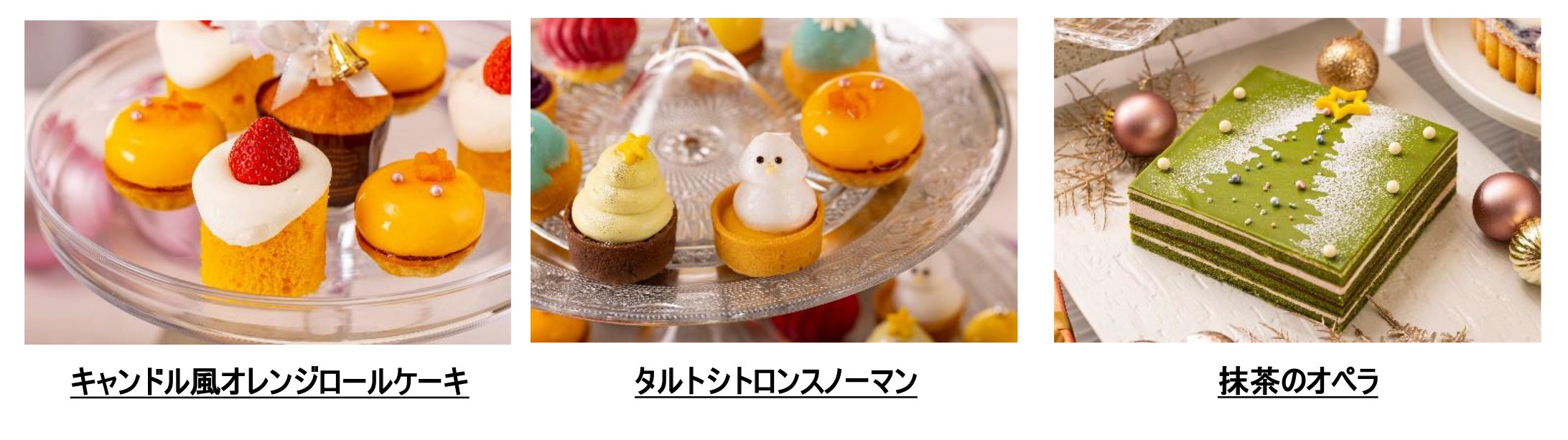 スイーツ フレジェ、タルトフレーズ、抹茶のシフォンケーキ リース仕立て、フィンランド風ブルーベリーパイ、抹茶のオペラ、雲のように軽いレアチーズケーキ、キャンドル風オレンジロールケーキ、タルトシトロンスノーマン、シュトーレン など
