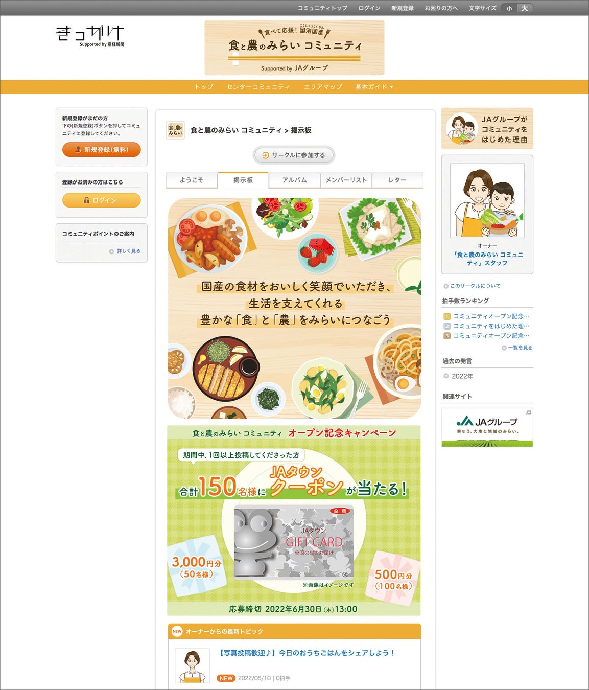 オープンを記念して、「食と農のみらい コミュニティ」にご登録いただき、コミュニティ内でコメントをご投稿いただいた方を対象に「JAタウンクーポン」が、計150名様(3,000円分を50名様、500円分を100名様)に当たるキャンペーンを実施します。同クーポンは、旬の農畜産物や特産品が満載の通販サイト「JAタウン」で使用可能です。キャンペーンの締め切りは2022年6月30日13時。コミュニティへの登録、参加は無料です。