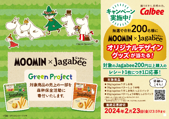 対象の「Jagabee」商品200円以上をご購入いただいたお客様に、抽選で合計200名様に「ムーミン」と「Jagabee」の限定オリジナルグッズが当たるマストバイキャンペーンを実施します。