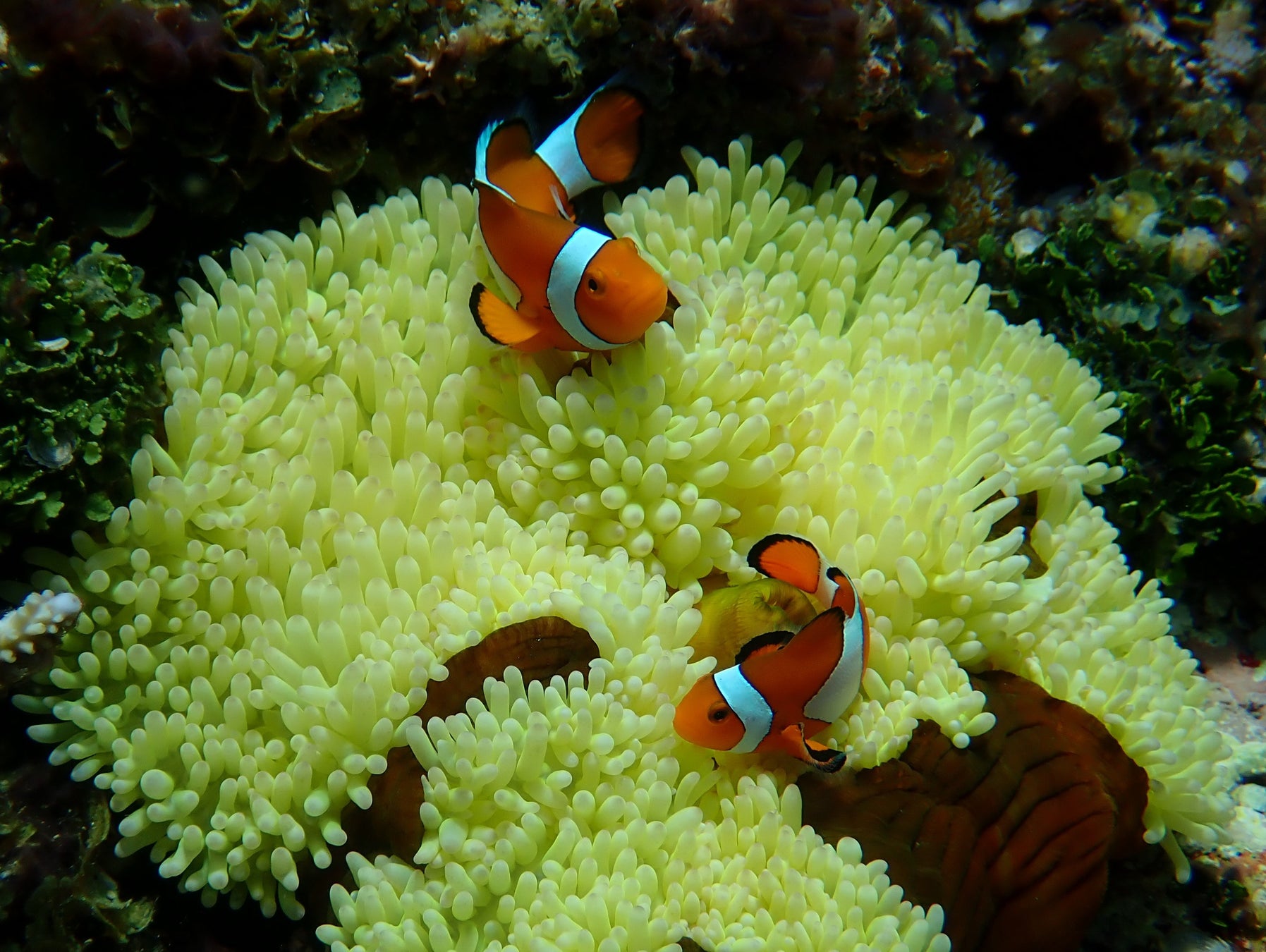 西表島の海の生き物について興味を持ったら、実際に海の中にいる気になるあの子を探しに行きます。イソギンチャクの家の中にすぐ隠れてしまうカクレクマノミや、カラフルで個性的な模様のモンガラカワハギなど、海の上からでは見ることができない世界で暮らす生き物によく出会える場所へガイドが案内します。事前のレクチャーで知った魚やサンゴと仲良くなって、一緒に写真を撮ることもできます。