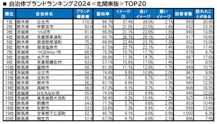 いい部屋ネット「自治体ブランドランキング2024<北関東版>」(街の住みここちランキング特別集計)発表
