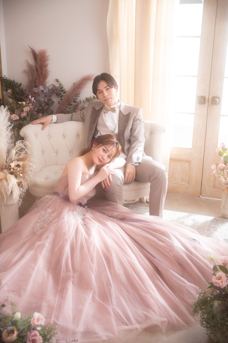 大人っぽさ:くすみピンクやグレー系ピンクが、大人花嫁の肌をきれいに見せ、上品な印象が好みの花嫁にぴったりです。ホテル披露宴などにもおすすめです。