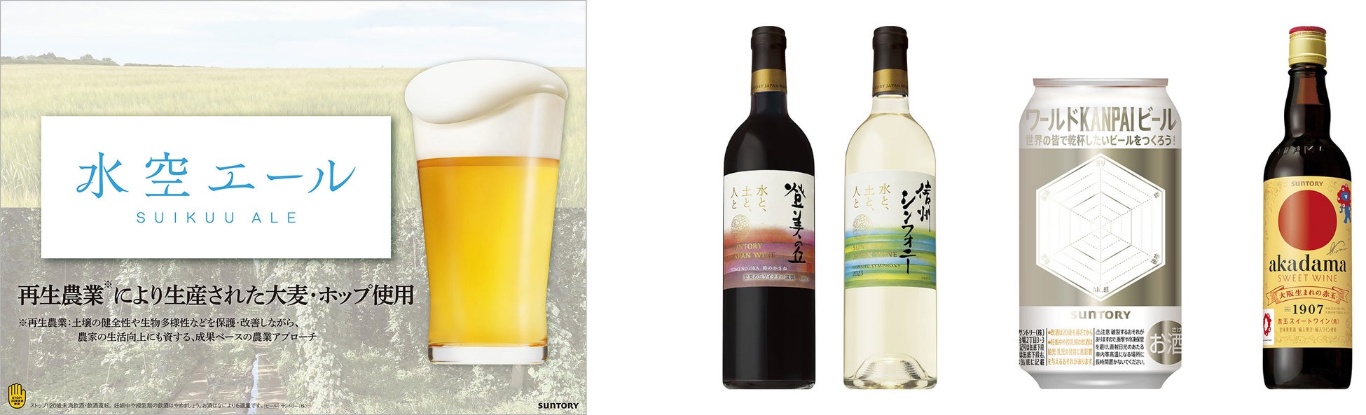 今回の大阪・関西万博では、再生農業※2原料を使用した当社初のビール「水空(すいくう)エール」、CO2削減びんを使用した日本ワイン「SUNTORY FROM FARM 登美の丘 赤 時のかさね」「同 信州 シンフォニー 2023」を大阪・関西万博会場に当社が出店するレストラン「水空 SUIKUU(すいくう)」で提供します。