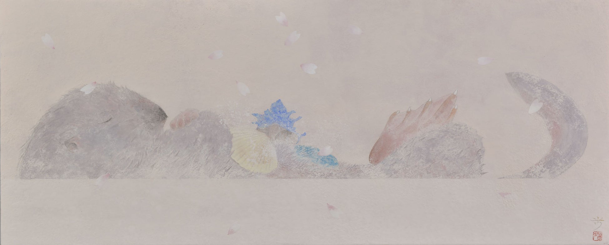 作家活動の最初期には、写実的な人物表現や神秘的な風景を描いていましたが、程なくしてオオサンショウウオをモチーフとして描く機会から、現在は両生類や動物、海の生き物が穏やかな色彩の中にそっと佇む姿を描き出しています。描かれた生き物たちが愛らしさとともに存在感をまとい、その静謐な画面の中で作家のさまざまな「想い」が作品に込められ、雄弁に語りかけてきます。また、近年はカウンターバーのモダンな景観の中、カクテルグラスで画面を大胆に分割した作品も描いています。岩絵具や金砂子で、グラスに注がれたアルコールの鮮やかな色や香気を巧みに表現されています。