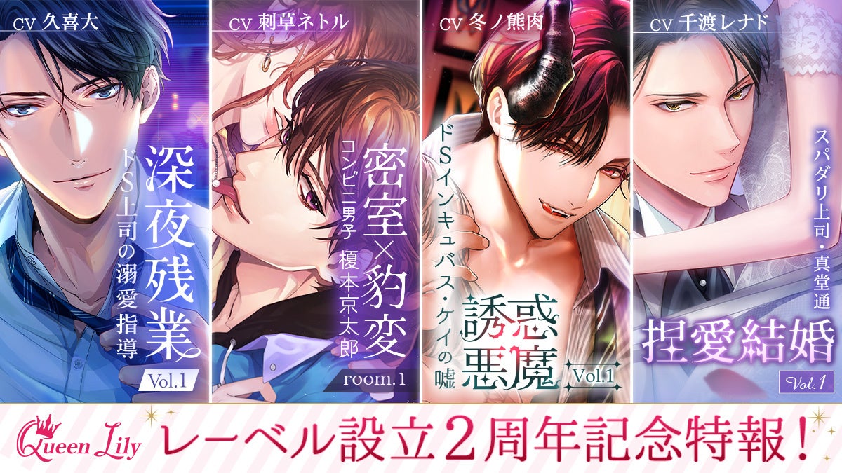 「Queen Lily」 は、“日常にうるおいとスパイスを…。すべてのオトナ女子に捧げる極上の耳キュンストーリー”をテーマに、現代を生きるオトナ女子に非日常のときめきを与えるシチュエーションドラマCDレーベルです。2021年に第一作目となる「深夜残業」シリーズの発売して以降、様々なシチュエーションで描く甘くて官能的なストーリーが多くの方に支持され、この度レーベル設立2周年を迎えます。