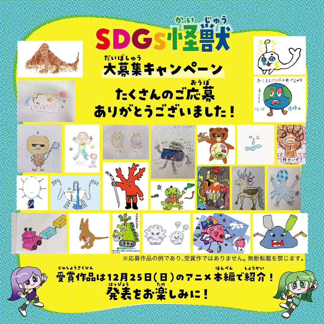 また今年7月には、みなさまが考えた新たな“SDGs怪獣”を募集する「SDGs怪獣大募集キャンペーン」を実施し、多くのみなさまにご応募をいただきました。受賞作品は2022年12月25日(日)のアニメ本編に登場しますので、発表をお楽しみにしてください。 ※当キャンペーンの応募受付は、すでに終了しています。