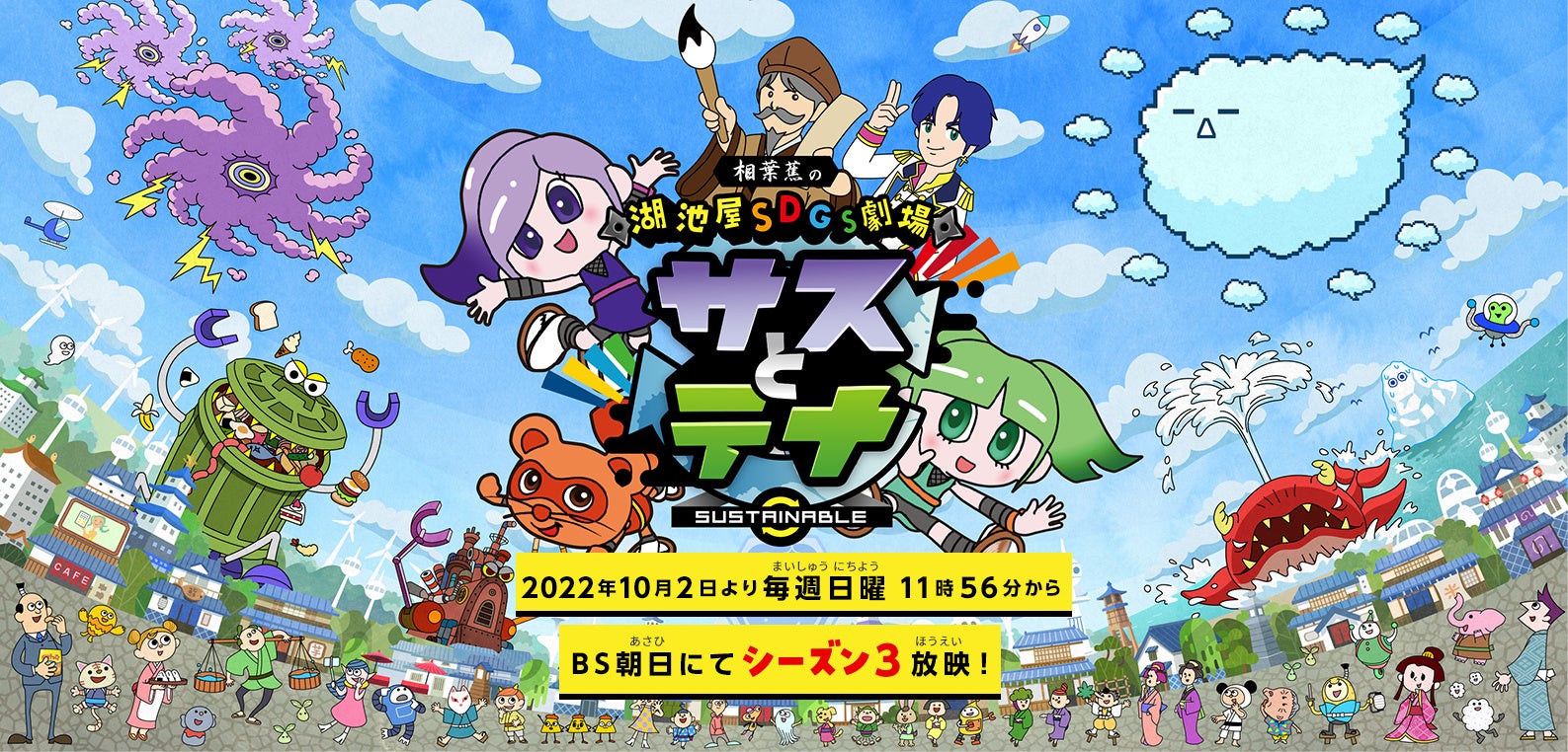 株式会社湖池屋(本社:板橋区/社長:佐藤章)は、SDGs推進活動の一環として、みんなが楽しくSDGsについて学べるアニメーション 湖池屋SDGs劇場「サスとテナ」を2021年10月より放映開始し、現在WEBサイトやYouTubeにてシーズン1・シーズン2の全26話を公開しています。この度、アニメを通じたSDGs推進活動を継続し、さらなる啓発に繋げたいとの想いから、シーズン3の放映※が決定しました。 ※2022年10月2日(日)よりBS朝日にて放映開始