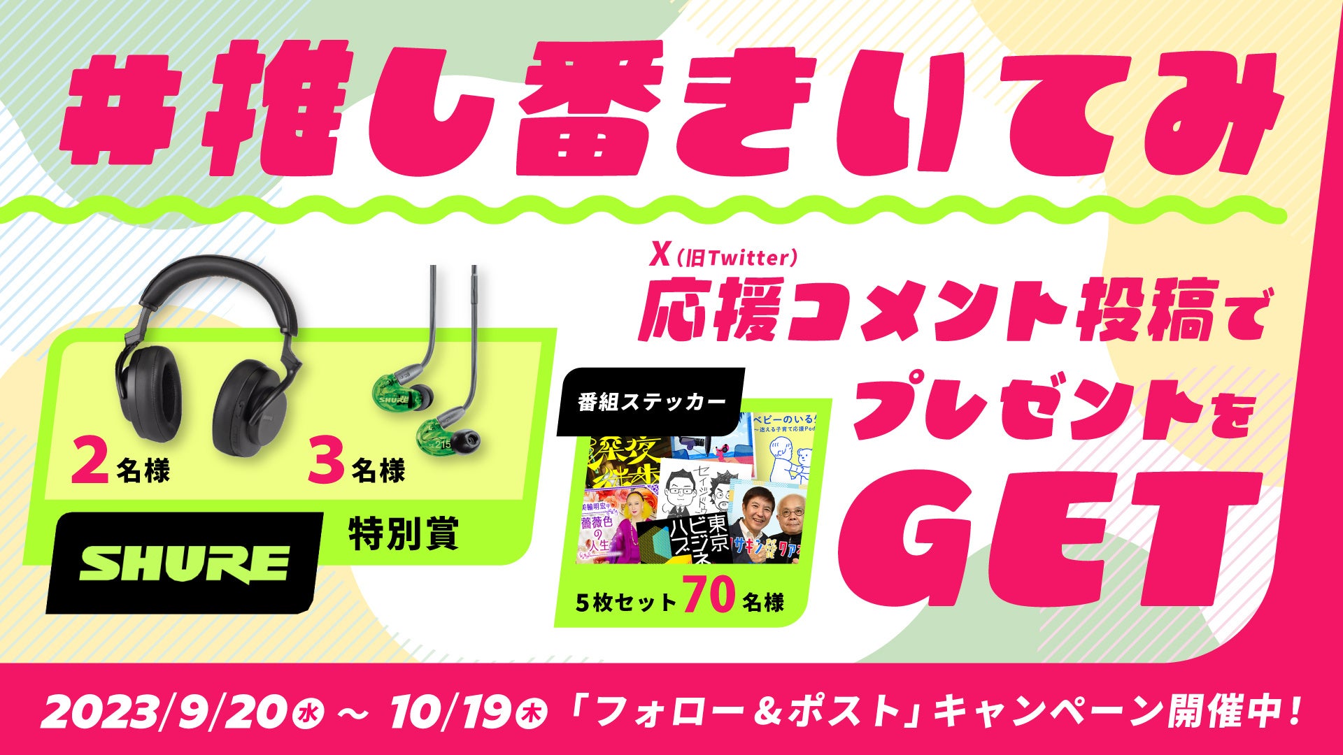 各番組ファンのアツイ「推し番の魅力」を、まだ聴いたことのない周りの方や番組出演者やスタッフへ向けて、X(旧Twitter)で語って届けてください。「推したい番組名の公式ハッシュタグ」とキャンペーン指定ハッシュタグ「#推し番きいてみ」を必ずつけて、アナタがどうしてその番組が好きなのか?おすすめ神回など応援コメント投稿でキャンペーンに参加となります。